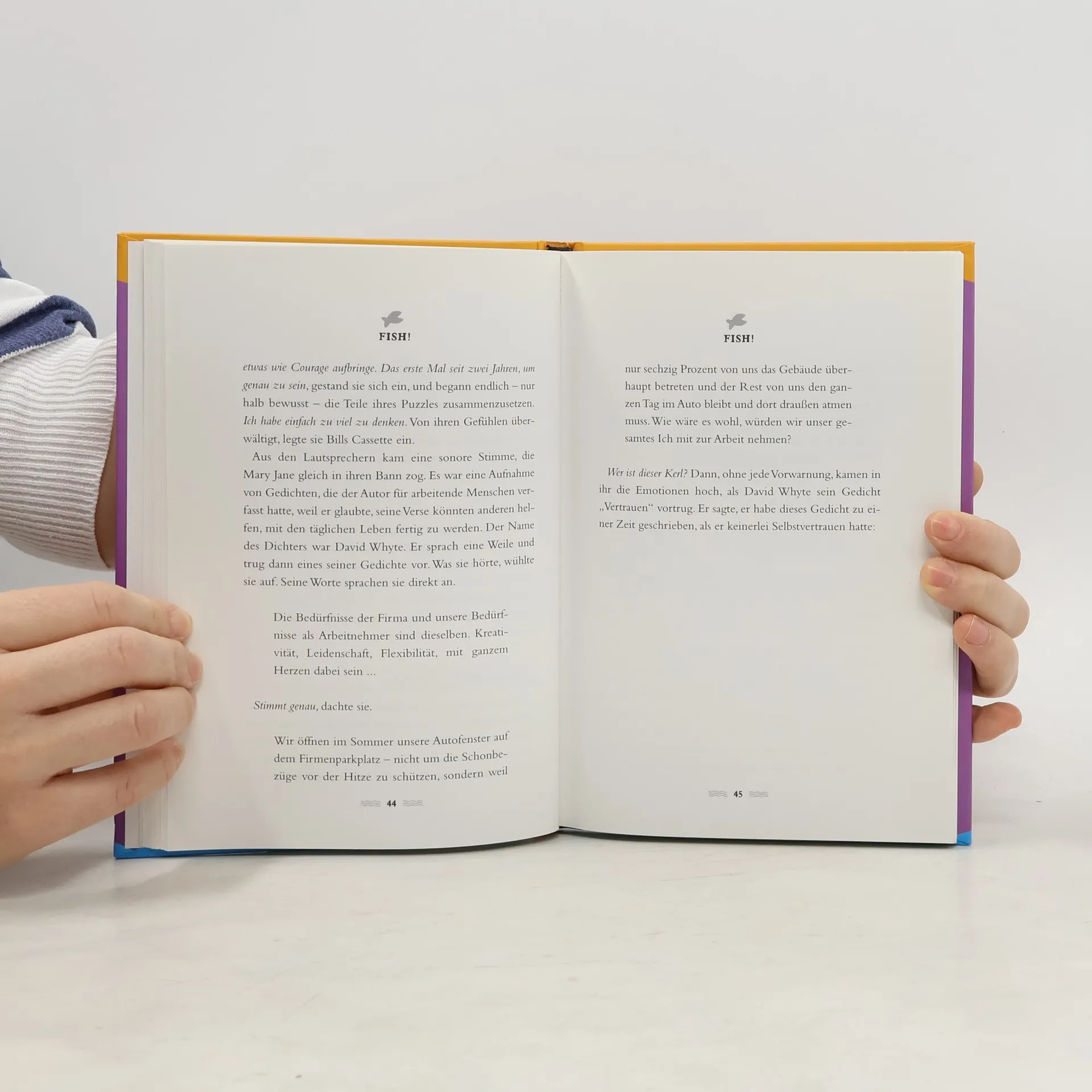 „Fish!™“ verrät das Erfolgsgeheimnis des weltberühmten Pike Place Fischmarkts in Seattle. Die Geschichte zeigt, wie unglaublich wichtig es ist, eine positive Lebenseinstellung zu haben. Das Autorenteam gibt dem Leser vier schlichte Handlungsmaximen mit auf den Weg, die seine Arbeits- und Lebenseinstellung revolutionieren werden. Denn wer beschließt, alles, was er ohnehin tun muss, mit Freude zu tun, motiviert sich selbst und kann ein ganzes Team erfolgreich zu Spitzenleistungen bringen.