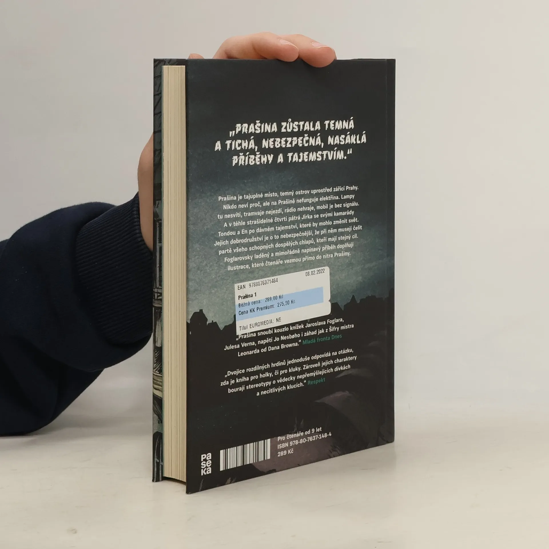 Prašina je tajuplné místo, temný ostrov uprostřed zářící Prahy. Nikdo neví proč, ale na Prašině nefunguje elektřina. Lampy tu nesvítí, tramvaje nejezdí, rádio nehraje, mobil je bez signálu. A v téhle strašidelné čtvrti pátrá Jirka se svými kamarády Tondou a En po dávném tajemství, které by mohlo změnit svět. Jejich dobrodružství je o to nebezpečnější, že při něm musejí čelit partě všeho schopných dospělých chlapů, kteří mají stejný cíl. Foglarovsky laděný a mimořádně napínavý příběh doplňují ilustrace, které čtenáře vezmou přímo do nitra Prašiny.