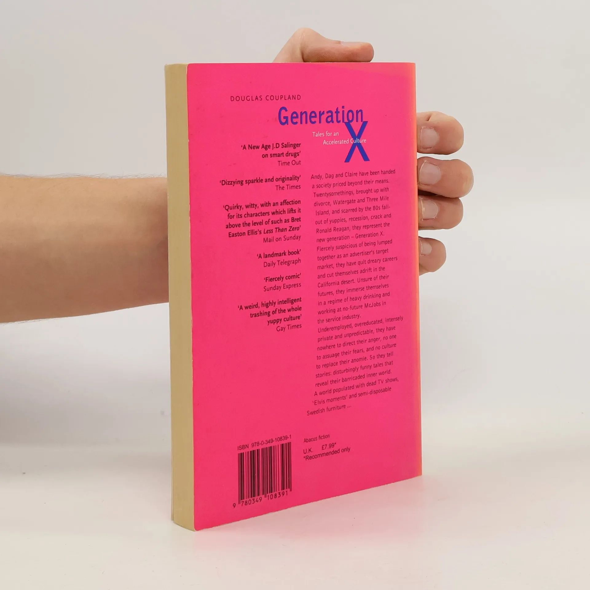 Andy, Dag and Claire have been handed a society priced beyond their means. Twentysomethings, brought up with divorce, Watergate and Three Mile Island, and scarred by the 80s fall-out of yuppies, recession, crack and Ronald Reagan, they represent the new generation - Generation X.Fiercely suspicious of being lumped together as an advertiser's target market, they have quit dreary careers and cut themselves adrift in the California desert. Unsure of their futures, they immerse themselves in a regime of heavy drinking and working at no-future McJobs in the service industry.Underemployed, overeducated, intensely private and unpredictable, they have nowhere to direct their anger, no one to assuage their fears, and no culture to replace their anomie. So they tell stories; disturbingly funny tales that reveal their barricaded inner world. A world populated with dead TV shows, 'Elvis moments' and semi-disposable Swedish furniture...