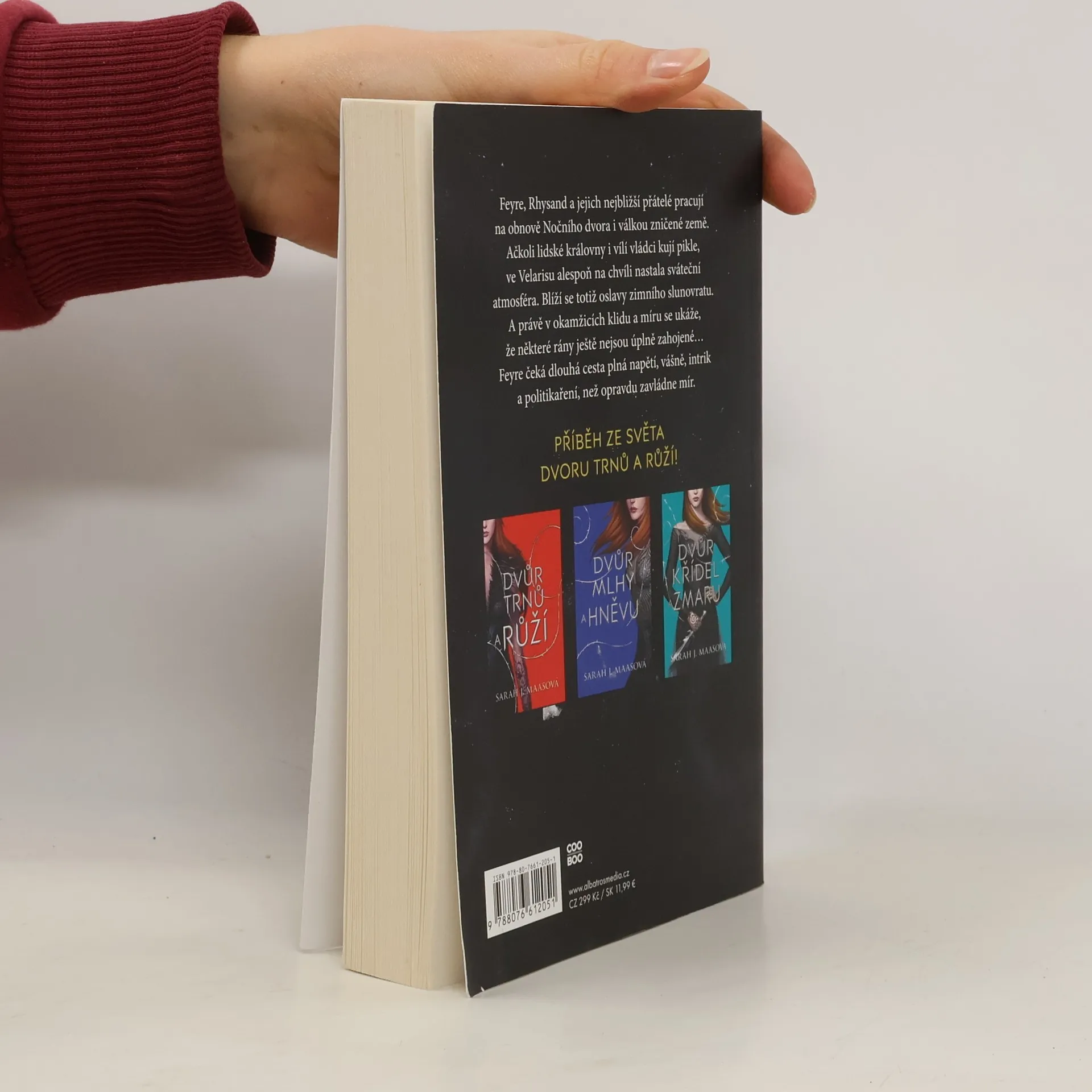 Pokračování bestsellerové young adult série Dvůr trnů a růží. Feyre, Rhysand a jejich nejbližší přátelé pracují na obnově Nočního dvora i válkou zničené země. Ačkoli lidské královny i vílí vládci kují pikle, ve Velarisu alespoň na chvíli nastala sváteční atmosféra. Blíží se totiž oslavy zimního slunovratu. A právě v okamžicích klidu a míru se ukáže, že některé rány ještě nejsou úplně zahojené… Feyre čeká dlouhá cesta plná napětí, vášně, intrik a politikaření, než opravdu zavládne mír.