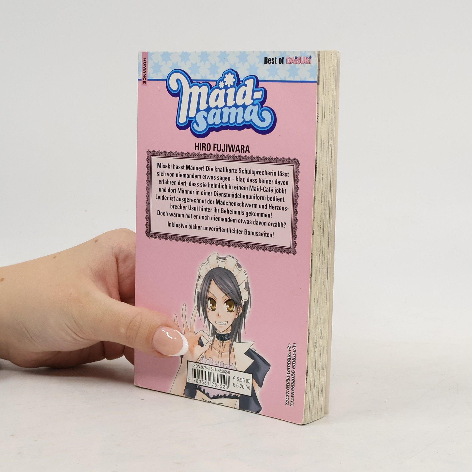 MAID-SAMA begeistert mit Spannung, Romantik und urkomischen Abenteuern. Zwischen Maid-Café und Schulalltag ist Chaos hier vorprogrammiert! Misaki hasst Männer! Die knallharte Schulsprecherin lässt sich von niemandem etwas sagen – klar, dass keiner davon erfahren darf, dass sie heimlich in einem Maid-Café jobbt und dort Männer in einer Dienstmädchenuniform bedient. Leider ist ausgerechnet der Mädchenschwarm und Herzensbrecher Usui hinter ihr Geheimnis gekommen! Doch warum hat er noch niemandem etwas davon erzählt? Inklusive bisher unveröffentlichter Bonusseiten! Der herzerwärmende Shojo-Klassiker! Weitere Infos: - empfohlen ab 12 Jahren - mit 18 Bänden und einem Sonderband abgeschlossen - Anime-Stream u. a. auf Crunchyroll und Anime on Demand - Anime-DVD/Blu-ray von KAZÉ Anime