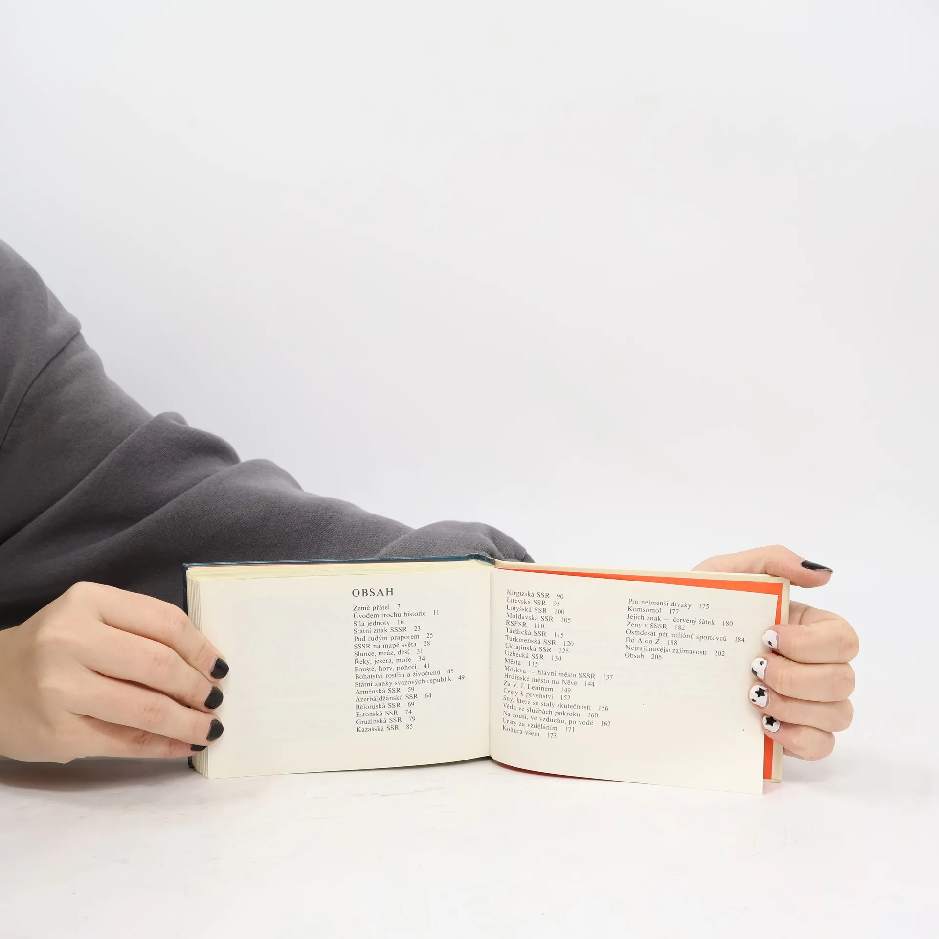 Ve stručných heslech přináší dětská zeměpisná knížka základní údaje o přírodních podmínkách, společenském uspořádání, národním hospodářství, dopravě, vědě a kultuře republik Sovětského svazu. Seznamuje se státním znakem SSSR i se znaky svazových republik, s pionýrskou a komsomolskou organizací, s postavením ženy, s vědeckými úspěchy, se sportovním a kulturním životem země aj. 2., doplněné a rozšířené vydání.