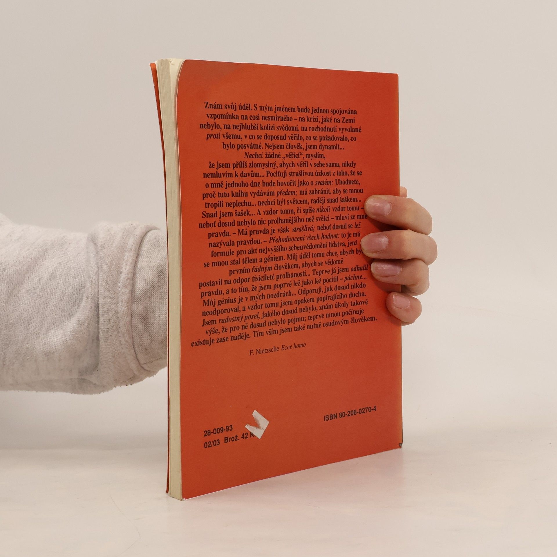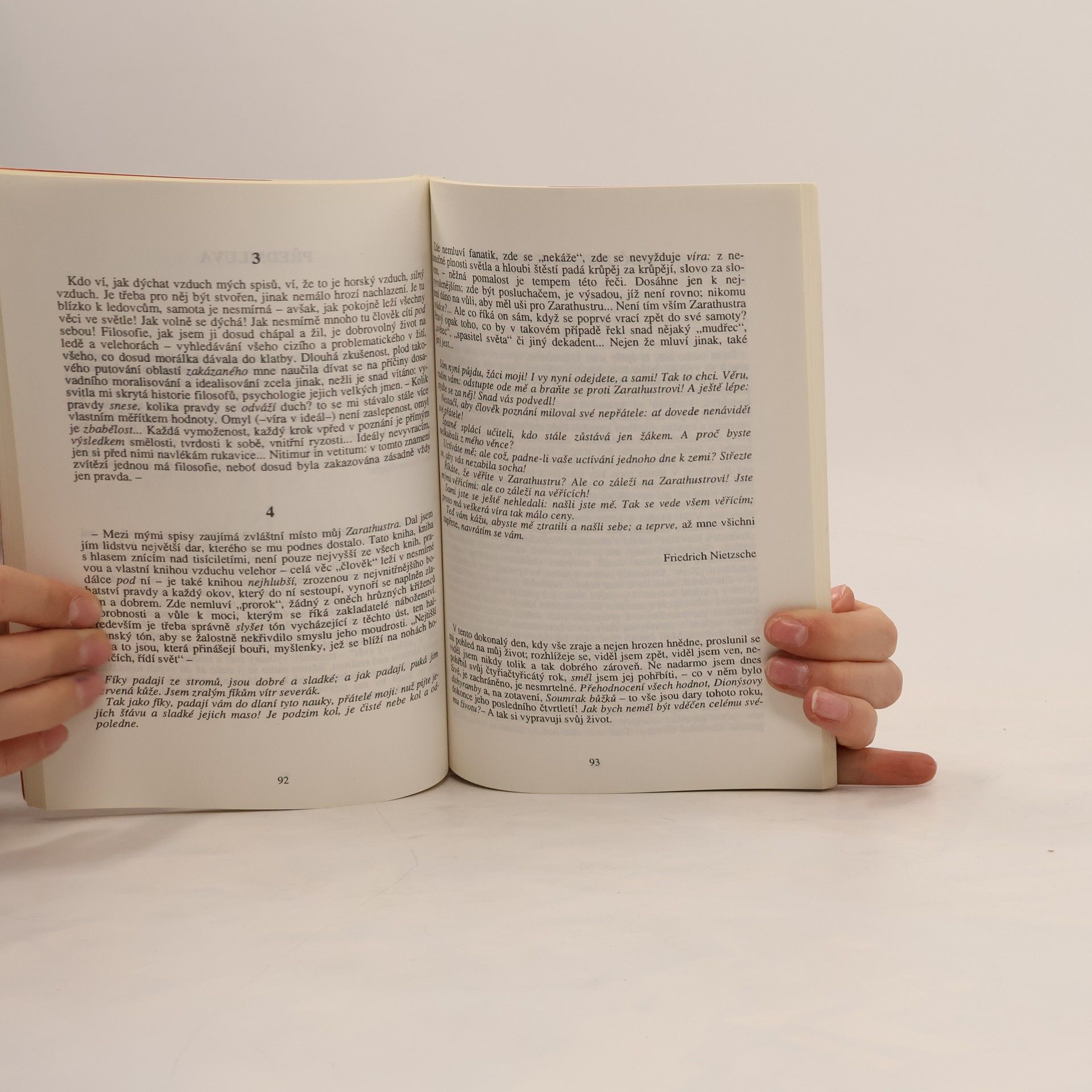 Znám poněkud své výsady spisovatelské; v jednotlivých případech také mám dosvědčeno, jak přivyknutí mým spisům „kazí“ vkus. Nelze pak už prostě snésti jiné knihy, ze všech nejméně knihy filosofické. Je to vyznamenání, jemuž není rovno, vstoupiti do tohoto vyššího a delikátního světa – člověk nesmí k tomu nikterak být Němcem; je to na konec vyznamenání, kterého je třeba si zasloužiti. Ale kdo je se mnou spřízněn výší chtění, prožije přitom pravé ekstase učení: neboť přicházím z výší, jichž nikdy nedoletěl pták, znám propasti do nichž ještě ničí noha nezbloudila. Bylo mi řečeno, že není možné, odložit moji knihu – že prý ruším i noční klid…