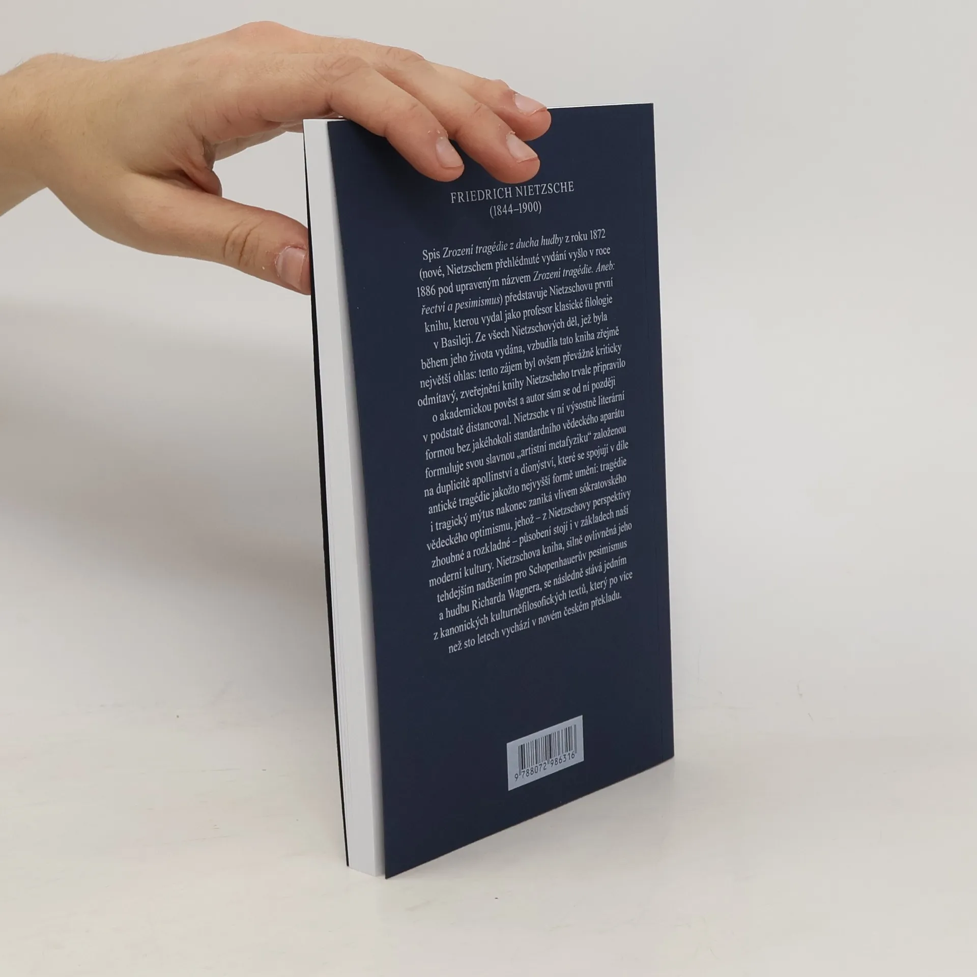 Spis Zrození tragédie z ducha hudby z roku 1872 (nové, Nietzschem přehlédnuté vydání vyšlo v roce 1886 pod upraveným názvem Zrození tragédie. Aneb: řectví a pesimismus) představuje Nietzschovu první knihu, kterou vydal jako profesor klasické filologie v Basileji. Ze všech Nietzschových děl, jež byla během jeho života vydána, vzbudila tato kniha zřejmě největší ohlas: tento zájem byl ovšem převážně kriticky odmítavý, zveřejnění knihy Nietzscheho trvale připravilo o akademickou pověst a autor sám se od ní později v podstatě distancoval. Nietzsche v ní výsostně literární formou bez jakéhokoli standardního vědeckého aparátu formuluje svou slavnou „artistní metafyziku" založenou na duplicitě apollinství a dionýství, které se spojují v díle antické tragédie jakožto nejvyšší formě umění: tragédie i tragický mýtus nakonec zaniká vlivem sókratovského vědeckého optimismu, jehož – z Nietzschovy perspektivy zhoubné a rozkladné – působení stojí i v základech naší moderní kultury. Nietzschova kniha, silně ovlivněná jeho tehdejším nadšením pro Schopenhauerův pesimismus a hudbu Richarda Wagnera, se následně stává jedním z kanonických kulturněfilosofických textů, který po více než sto letech vychází v novém českém překladu.