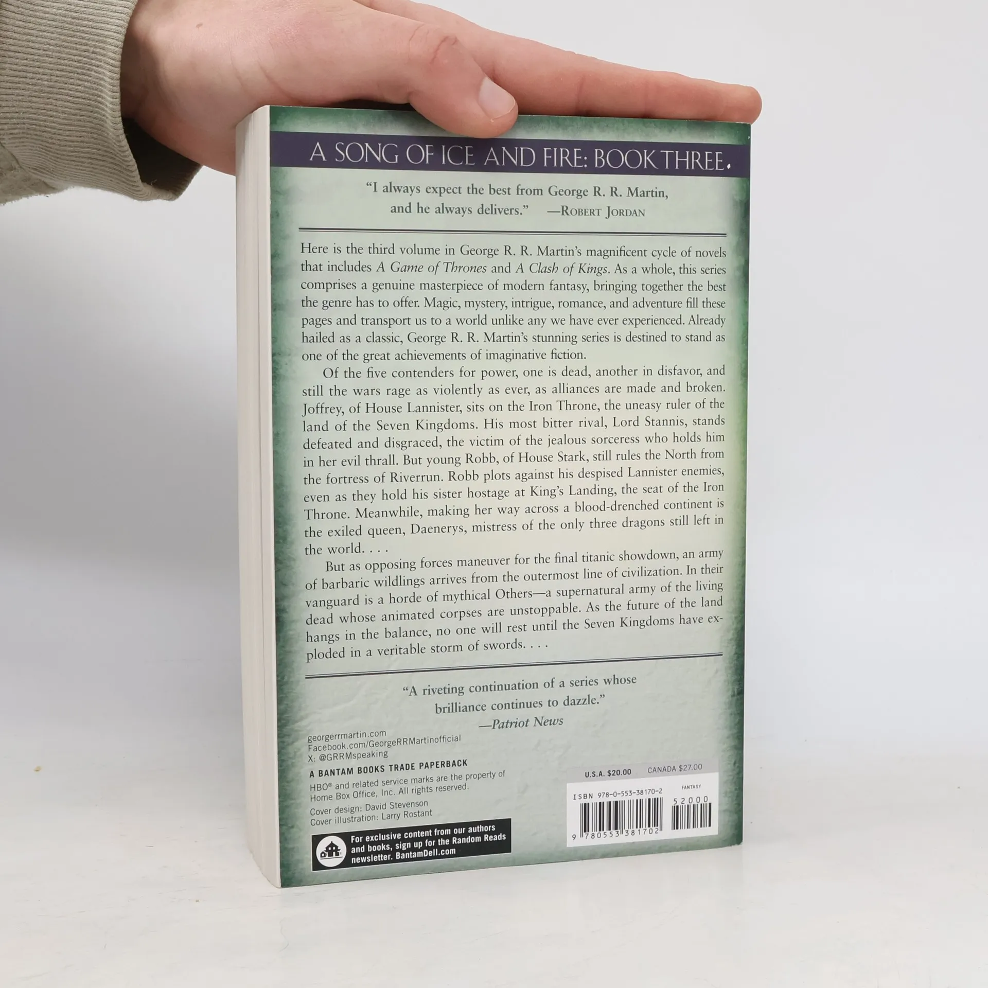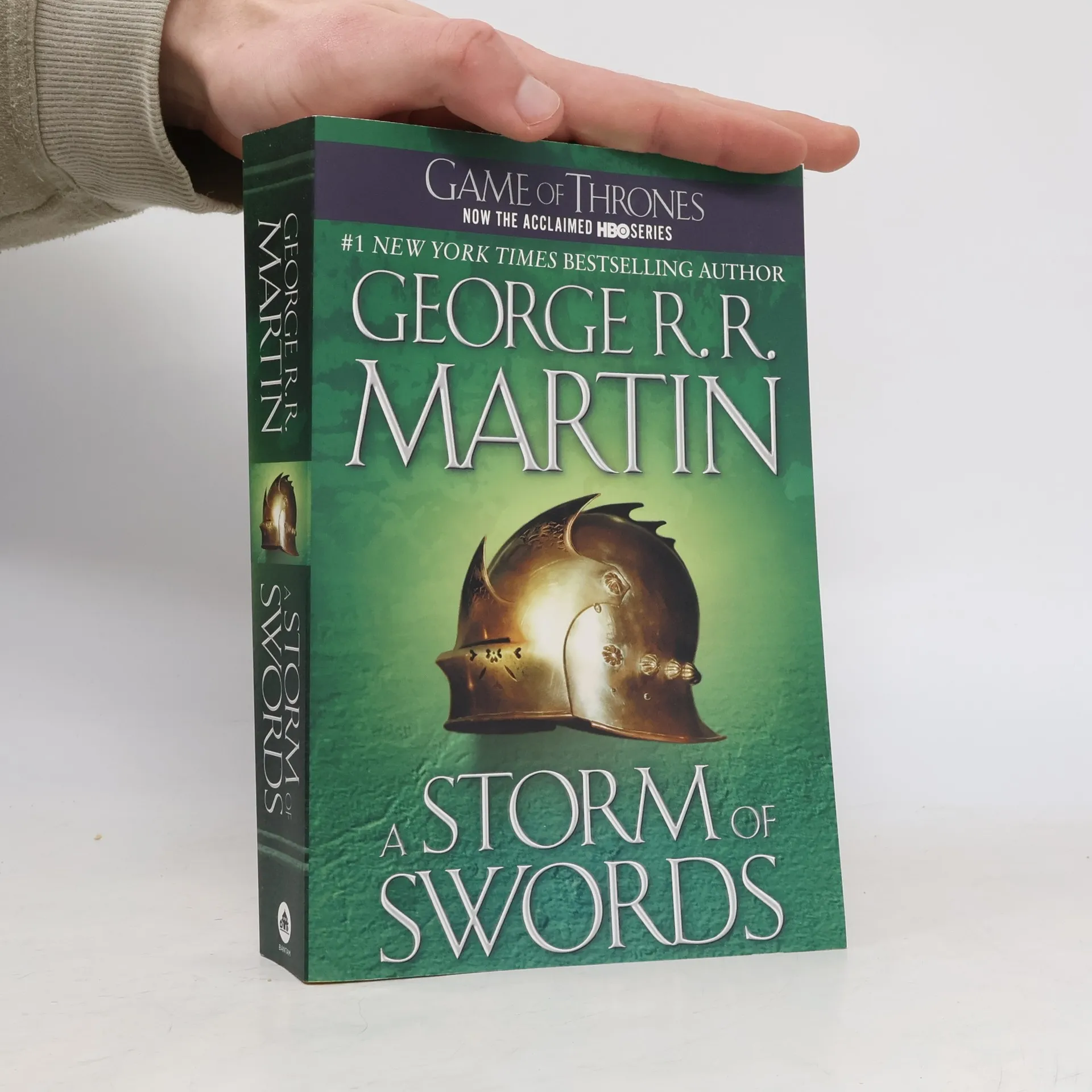 THE BOOK BEHIND THE THIRD SEASON OF GAME OF THRONES, AN ORIGINAL SERIES NOW ON HBO. Here is the third book in the landmark series that has redefined imaginative fiction and become a modern masterpiece. A STORM OF SWORDS Of the five contenders for power, one is dead, another in disfavor, and still the wars rage. Joffrey sits on the Iron Throne, the uneasy ruler of the Seven Kingdoms. His most bitter rival, Lord Stannis, stands defeated and disgraced, victim of the sorceress who holds him in her thrall. Young Robb still rules the North from the fortress of Riverrun. Meanwhile, making her way across a blood-drenched continent is the exiled queen, Daenerys, mistress of the only three dragons left in the world. As opposing forces maneuver for the final showdown, an army of barbaric wildlings arrives from the outermost limits of civilization, accompanied by a supernatural army of the living dead. As the future of the land hangs in the balance, no one will rest until the Seven Kingdoms have exploded in a veritable storm of swords. . . . A GAME OF THRONES • A CLASH OF KINGS • A STORM OF SWORDS • A FEAST FOR CROWS • A DANCE WITH DRAGONS
