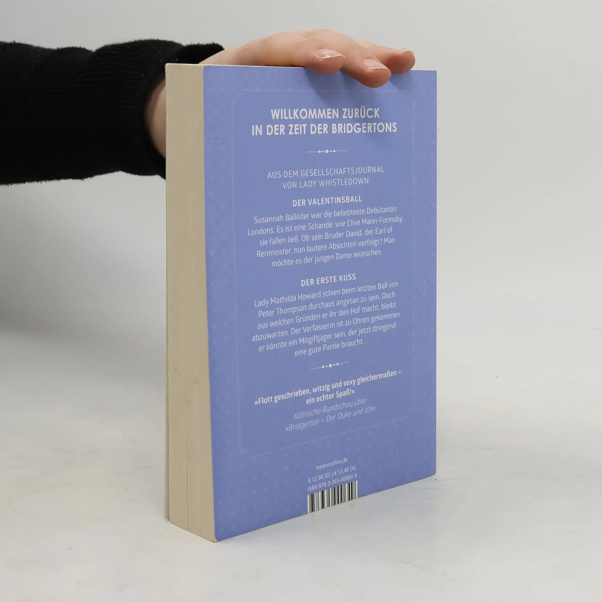 Der Valentinsball Susannah Ballister war die beliebteste Debütantin Londons. Es ist eine Schande, wie Clive Mann-Formsby sie fallen ließ. Ob sein Bruder David, der Earl of Renminster, nun lautere Absichten verfolgt? Man möchte es der jungen Dame wünschen. Der erste Kuss Lady Mathilda Howard schien beim letzten Ball von Peter Thompson durchaus angetan zu sein. Doch aus welchen Gründen er ihr den Hof macht, bleibt abzuwarten. Der Verfasserin ist zu Ohren gekommen, er könnte ein Mitgiftjäger sein, der jetzt dringend eine gute Partie braucht. Ihre Lady Whistledown, die wie immer verspricht, über die neusten Ereignisse zu berichten.
