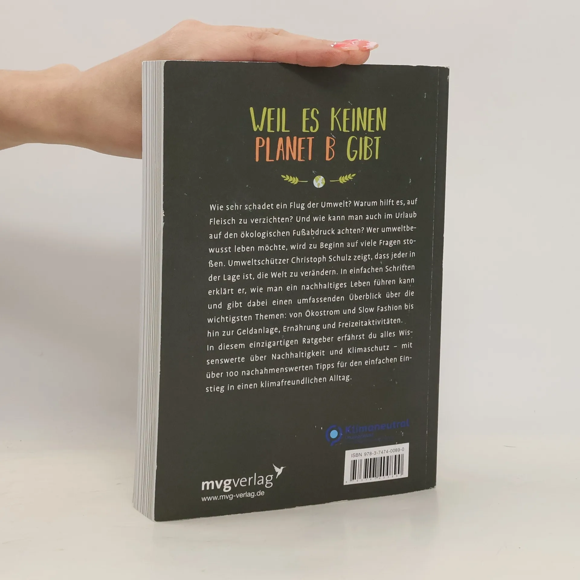 Wie sehr schadet ein Flug der Umwelt? Warum hilft es, auf Fleisch zu verzichten? Und wie kann man auch im Urlaub auf den ökologischen Fußabdruck achten? Wer umweltbewusst leben möchte, wird zu Beginn auf viele Fragen stoßen. Umweltschützer Christoph Schulz zeigt, dass jeder in der Lage ist, die Welt zu verändern. In einfachen Schritten erklärt er, wie man ein nachhaltiges Leben führen kann und gibt dabei einen umfassenden Überblick über die wichtigsten Themen: von Ökostrom und Slow Fashion bis hin zur Geldanlage, Ernährung und Freizeitaktivitäten. In diesem einzigartigen Ratgeber erfährst du alles Wissenswerte über Nachhaltigkeit und Klimaschutz – mit über 100 nachahmenswerten Tipps für den einfachen Einstieg in einen klimafreundlichen Alltag.