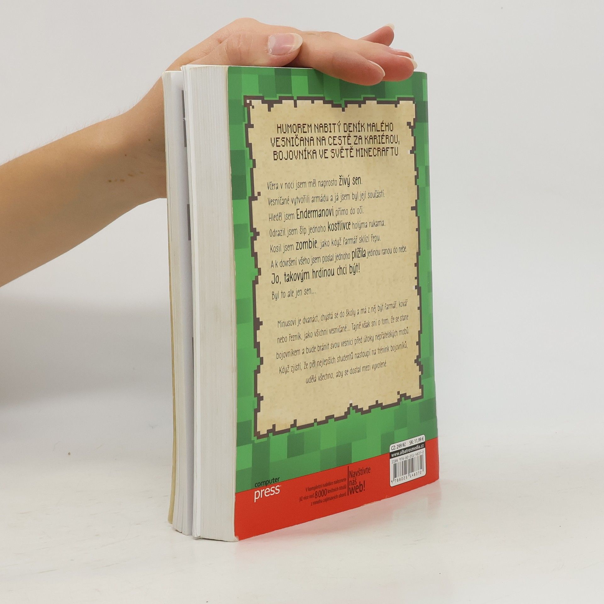 Humorem nabitý deník malého vesničana na cestě za kariérou bojovníka ve světě Minecraftu. Včera v noci jsem měl naprosto živý sen. Vesničané vytvořili armádu a já jsem byl její součástí. Hleděl jsem Endermanovi přímo do očí. Odrazil jsem šíp jednoho kostlivce holýma rukama. Kosil jsem zombie, jako když farmář sklízí řepu. A k dovršení všeho jsem poslal jednoho plížila jedinou ranou do nebe. Jo, takovým hrdinou chci být. Byl to ale jen sen... Minusovi je dvanáct, chystá se do školy a má z něj být farmář, kovář nebo řezník, jako všichni vesničané... Tajně však sní o tom, že se stane bojovníkem a bude bránit svou vesnici před útoky nepřátelských mobů. Když zjistí, že pět nejlepších studentů nastoupí na trénink bojovníků, udělá všechno, aby se dostal mezi vyvolené. Přeloženo z francouzské verze anglického originálu.