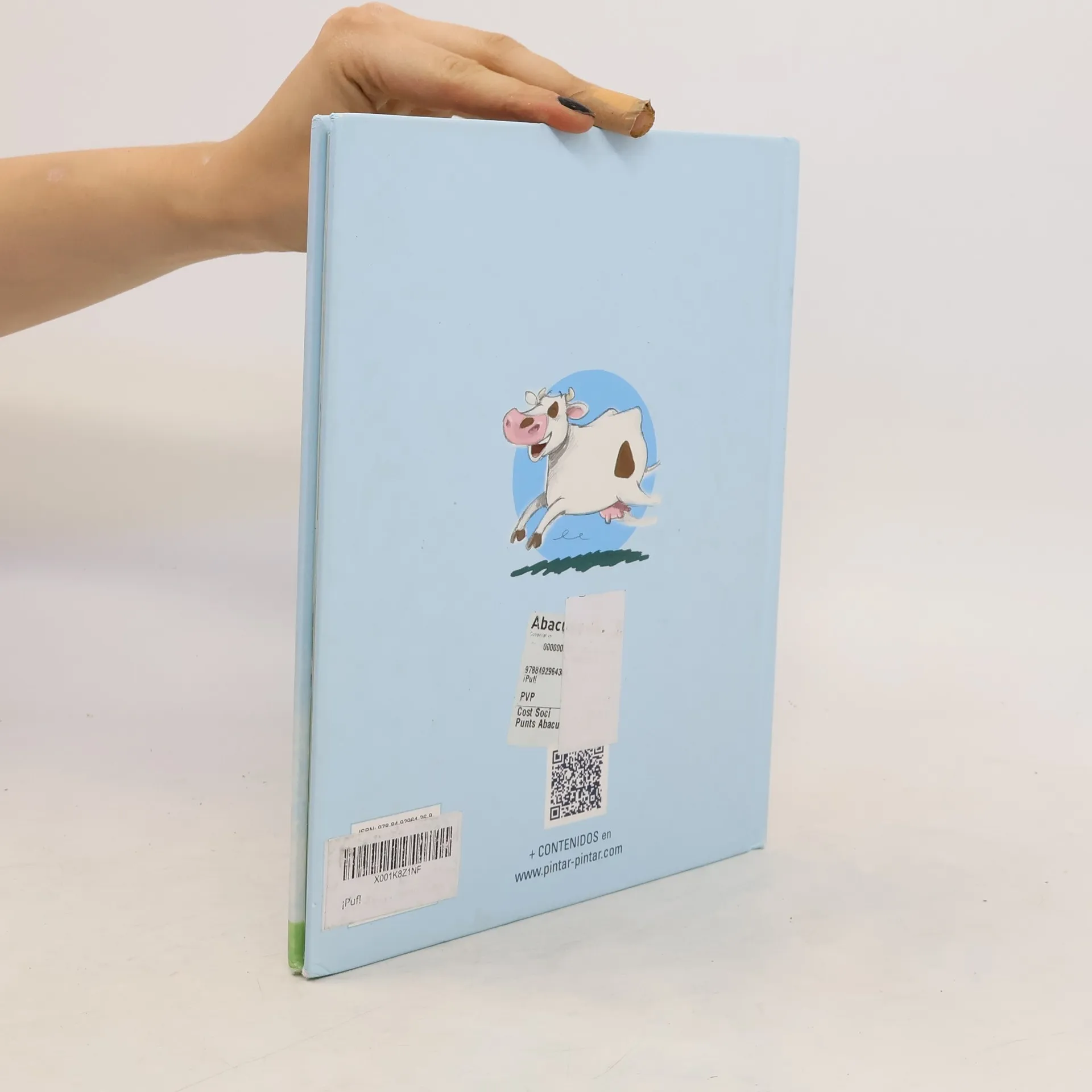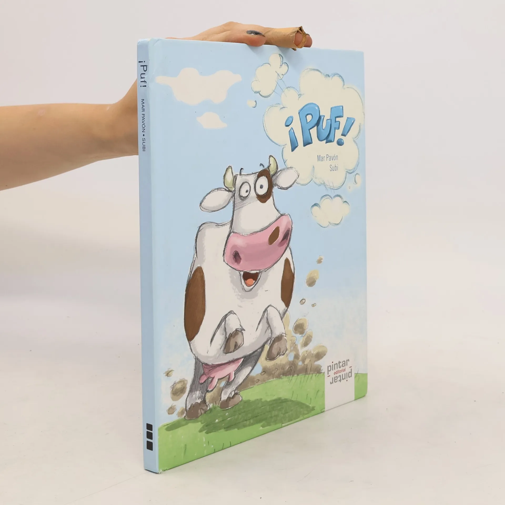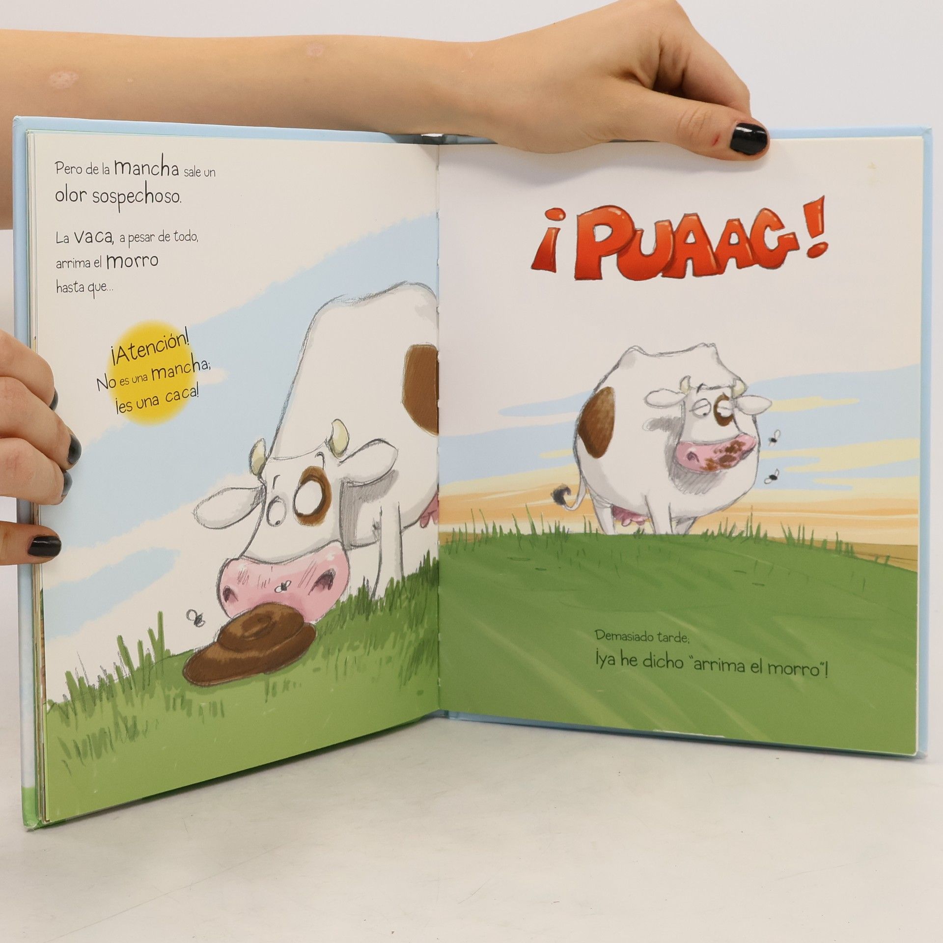 Una vaca ingenua y muy, muy obstinada y una mancha traviesa son el punto de partida de esta hilarante historia a medio camino entre el álbum ilustrado y el cómic. Con texto de estructura circular que acumula por igual adjetivos y expectativas, la lectura del mismo –en silencio o, mejor aún, en voz alta– supone un goce para los más pequeños, quienes, además, fácilmente se sentirán identificados con la protagonista, que peca de atolondrada, candorosa y exasperantemente tenaz, rasgos estos, sin lugar a dudas, muy comunes en la más tierna infancia. Subi realiza aquí un trabajo excelente que, sin embargo, lejos de aspirar a la magnificencia estética, apuesta por la sencillez en el trazo y la naturalidad en los tonos, entre los que evidentemente predominan el azul del cielo y el verde de la hierba, consiguiendo, en conjunto, que la obra se acerque al género de la historieta, a lo que también contribuyen las numerosas onomatopeyas que se incluyen el texto, así como los populares bocadillos característicos del citado género.