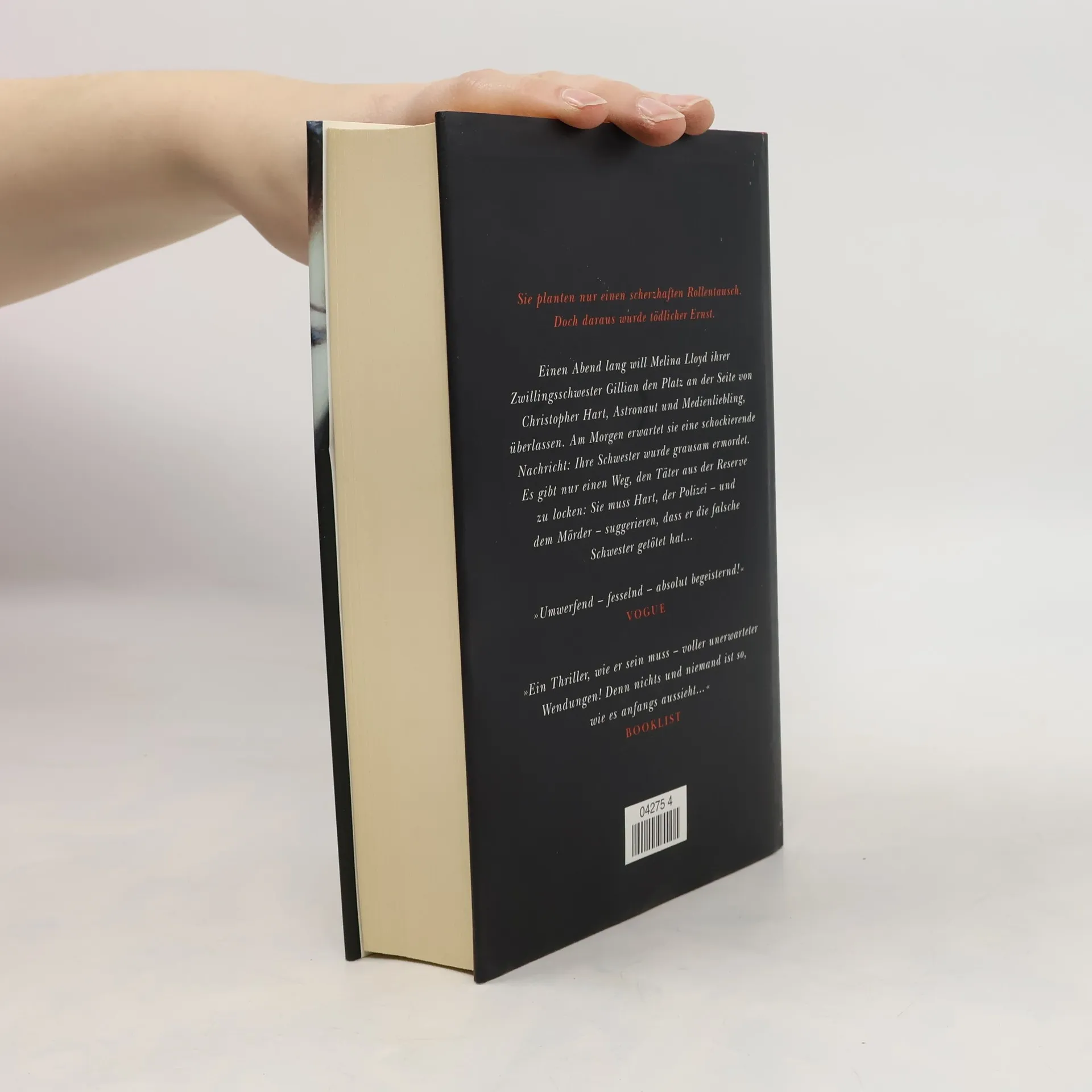 Sie planten einen scherzhaften Rollentausch, doch daraus wurde tödlicher Ernst: Einen Abend lang will Melina Lloyd ihrer Zwillingsschwester Gillian den Platz an der Seite von Christopher Hart, Astronaut und Medienliebling, überlassen. Doch am Morgen erwartet sie eine schockierende Nachricht, denn ihre Schwester wurde grausam ermordet. Es gibt nur einen Weg, den Täter aus der Reserve zu locken: Sie muss Christopher Hart, der Polizei – und dem Mörder – einreden, dass aus Versehen die falsche Schwester getötet wurde ...