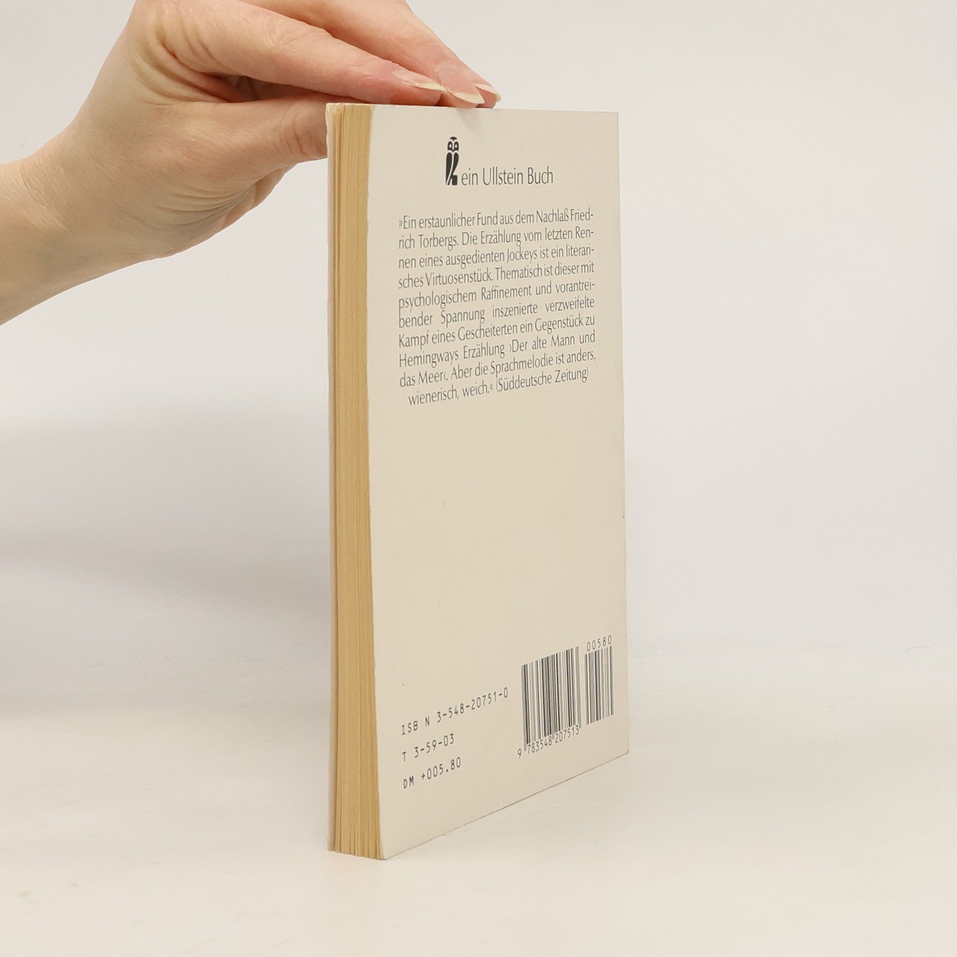Ein erstaunlicher Fund aus dem Nachlaß Friedrich Torbergs. Die Erzählung vom letzten Rennen eines ausgedienten Jockeys ist ein literarisches Virtuosenstück. Thematisch ist dieser mit psychologischem Raffinement und vorantreibender Spannung inszenierte verzweifelte Kampf eines Gescheiterten ein Gegenstück zu Hemingways Erzählung "Der alte Mann und das Meer". Aber die Sprachmelodie ist anders, wienerisch, weich.