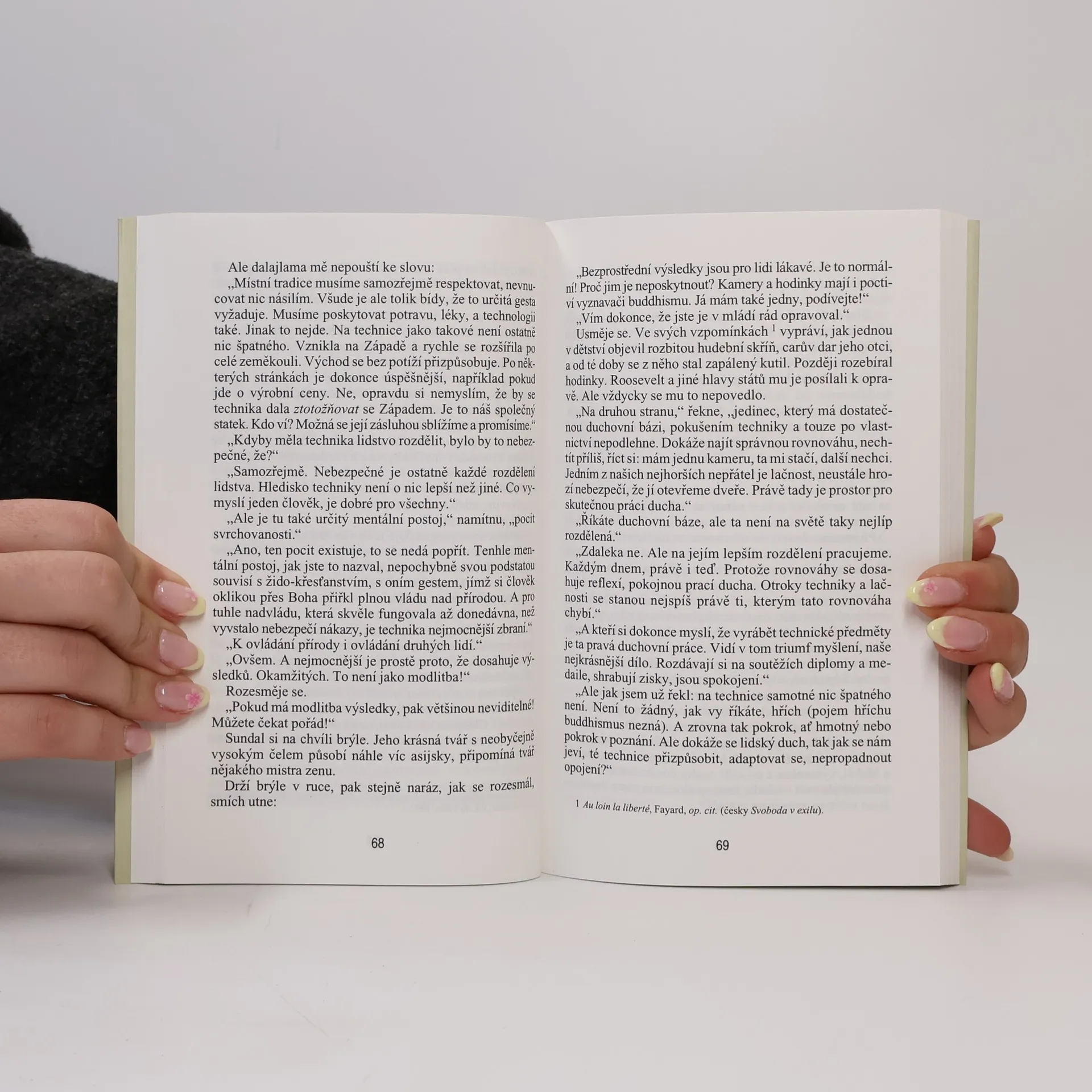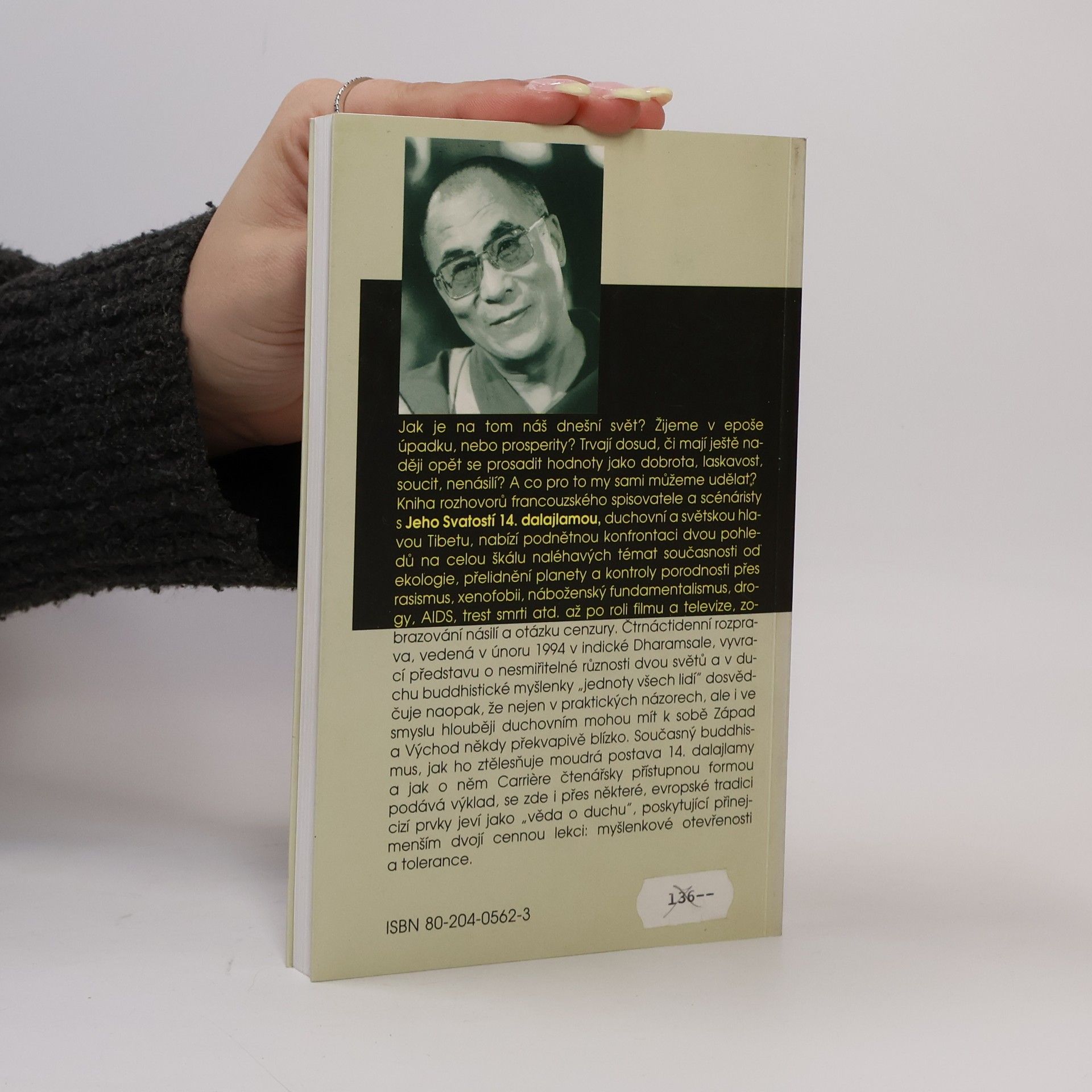 Jak je na tom náš dnešní svět? Žijeme v epoše úpadku, nebo prosperity? Trvají dosud, či mají ještě naději opět se prosadit hodnoty jako dobrota, laskavost, soucit, nenásili? A co pro to my sami můžeme udělat? Kniha rozhovorů francouzského spisovatele a scénáristy s Jeho Svatostí 14, dalajlamou, duchovní a světskou hlavou Tibetu, nabízí podnětnou konfrontaci dvou pohledů na celou škálu naléhavých témat současnosti od ekologie, přelidnění planety a kontroly porodnosti přes rasismus, xenofobii, náboženský fundamentalismus, drogy, AIDS, trest smrti atd. až po roli filmu a televize, zobrazování násilí a otázku cenzury. Čtrnáctidenní rozprava, vedená v únoru 1994 v indické Dharamsale, vyvrací představu o nesmiřitelné různosti dvou světů a v duchu buddhistické myšlenky "jednoty všech lidí" dosvědčuje naopak, že nejen v praktických názorech, ale i ve smyslu hlouběji duchovním mohou mít k sobě Západ a Východ někdy překvapivě blízko. Současný buddhismus, jak ho ztělesňuje moudrá postava 14. dalajlamy a jak o něm Carriére čtenářsky přístupnou formou podává výklad, se zde i přes některé, evropské tradici cizí prvky, jeví jako "věda o duchu", poskytující přinejmenším dvojí cennou lekci: myšlenkové otevřenosti a tolerance.