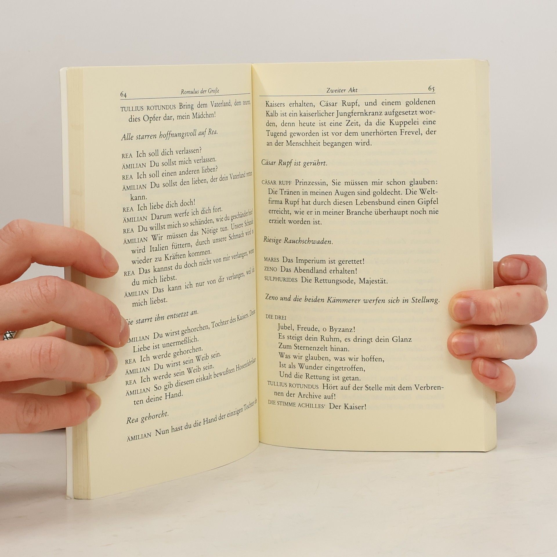 Eine ungeschichtliche historische Komödie in vier Akten»Kaiser Romulus Augustus hält das römische Weltreich für unmoralisch und will es als ›Richter Roms‹ liquidieren, indem er 467 n. Chr. tatenlos die einmarschierenden Germanen erwartet. Germanenfürst Odoaker freilich, ein leidenschaftlicher Hühnerzüchter wie Romulus, hat keinen sehnlicheren Wunsch als sich zu unterwerfen, um zu verhindern, daß die Germanen ›endgültig ein Volk der Helden‹ werden.«