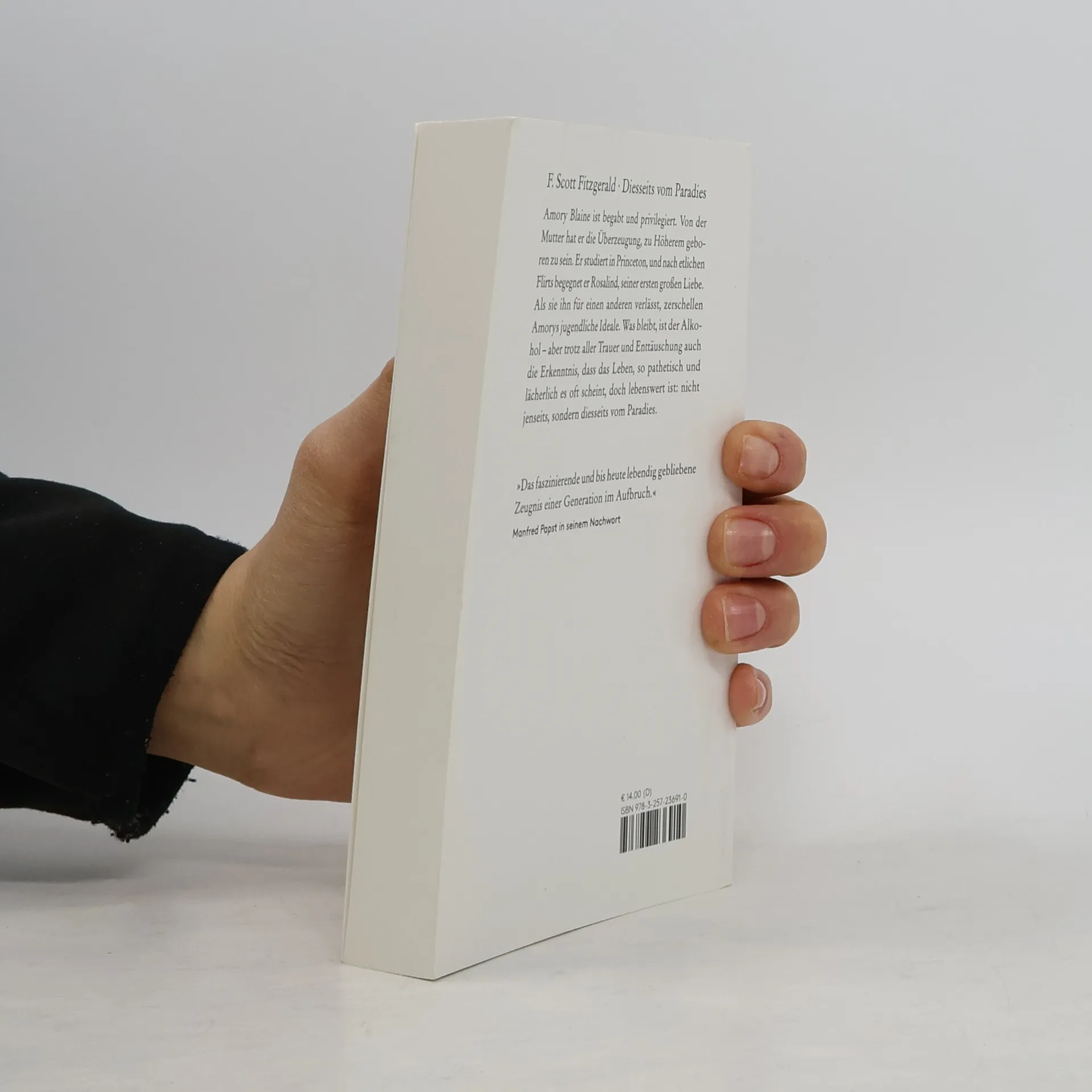 Amory Blaine ist begabt und privilegiert. Von der Mutter hat er die Überzeugung, zu Höherem geboren zu sein. Er studiert in Princeton, und nach etlichen Flirts begegnet er Rosalind, seiner ersten großen Liebe. Als sie ihn für einen anderen verläßt, zerschellen Amorys jugendliche Ideale. Was bleibt, ist der Alkohol aber trotz aller Trauer und Enttäuschung auch die Erkenntnis, daß das Leben, so pathetisch und lächerlich es oft scheint, doch lebenswert ist: nicht jenseits, sondern diesseits vom Paradies.