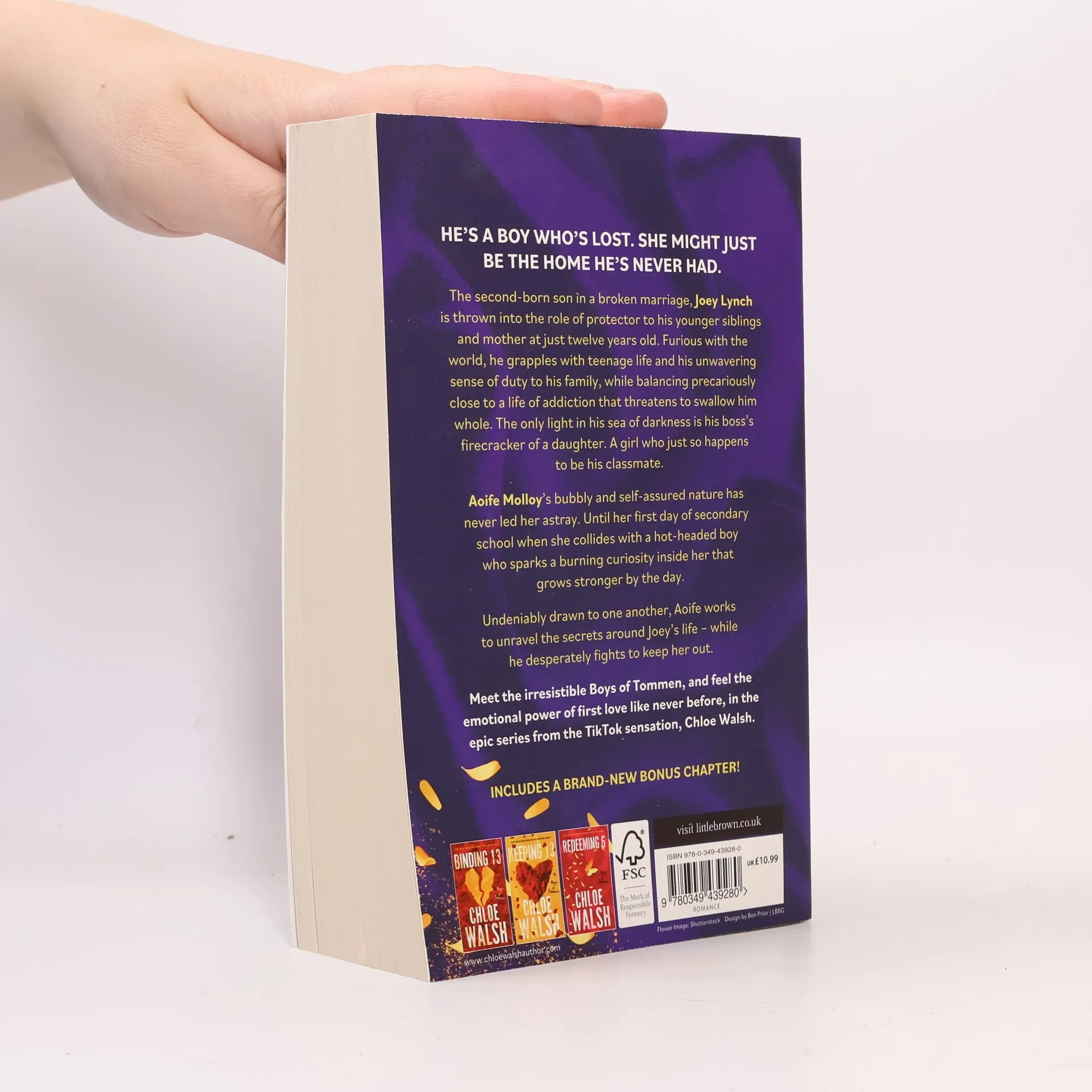 An epic love story unfolds in the third installment of the internationally bestselling series, captivating readers with its exploration of first love's power and pain. The Boys of Tommen series, celebrated on TikTok, is known for its emotional depth and unforgettable characters. Readers have praised the series as "absolute perfection" and "heartbreakingly beautiful," highlighting the author's exceptional talent for evoking strong emotions. Joey Lynch, the second-born son in a fractured family, has spent his life trying to hold everything together. When his older brother Darren leaves, twelve-year-old Joey takes on the role of protector for his mother and younger siblings. Struggling with self-loathing and anger, he navigates the challenges of adolescence while teetering on the brink of addiction. His only solace comes from Aoife Molloy, the fiery daughter of his boss, who becomes a beacon of light in his dark world. Aoife, confident and outspoken, finds herself drawn to Joey on her first day of secondary school. Their complicated friendship deepens as she seeks to uncover the secrets of his troubled life, while Joey fights to keep her at a distance. For more of Joey, Aoife, and the rest of the Boys of Tommen, explore the earlier books in the series: Binding 13, Keeping 13, and Saving 6.