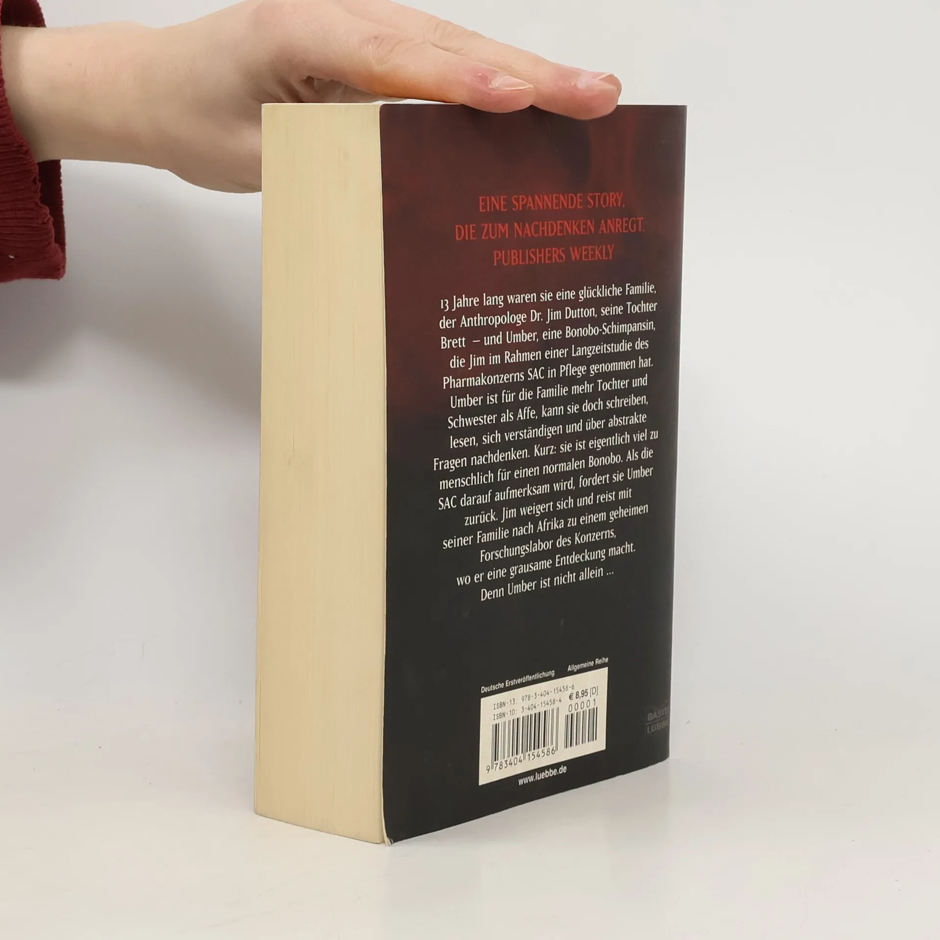 13 Jahre lang waren sie eine glückliche Familie: der Anthropologe Dr. Jim Dutton, seine Tochter Brett - und Umber, eine Bonobo-Schimpansin, die Jim im Rahmen einer Langzeitstudie des Pharmaziegiganten SAC in Pflege genommen hat. Umber ist für die Familie mehr Tochter und Schwester als Affe, kann sie doch schreiben, lesen, sich verständigen und über abstrakte Fragen nachdenken. Kurz: sie ist eigentlich viel zu menschlich für einen normalen Bonobo. Als die SAC darauf aufmerksam wird, fordert sie Umber zurück. Jim weigert sich und reist mit seiner Familie nach Afrika zu einem geheimen Forschungslabor des Konzerns, wo er eine grausame Entdeckung macht. Denn Umber ist nicht allein ...