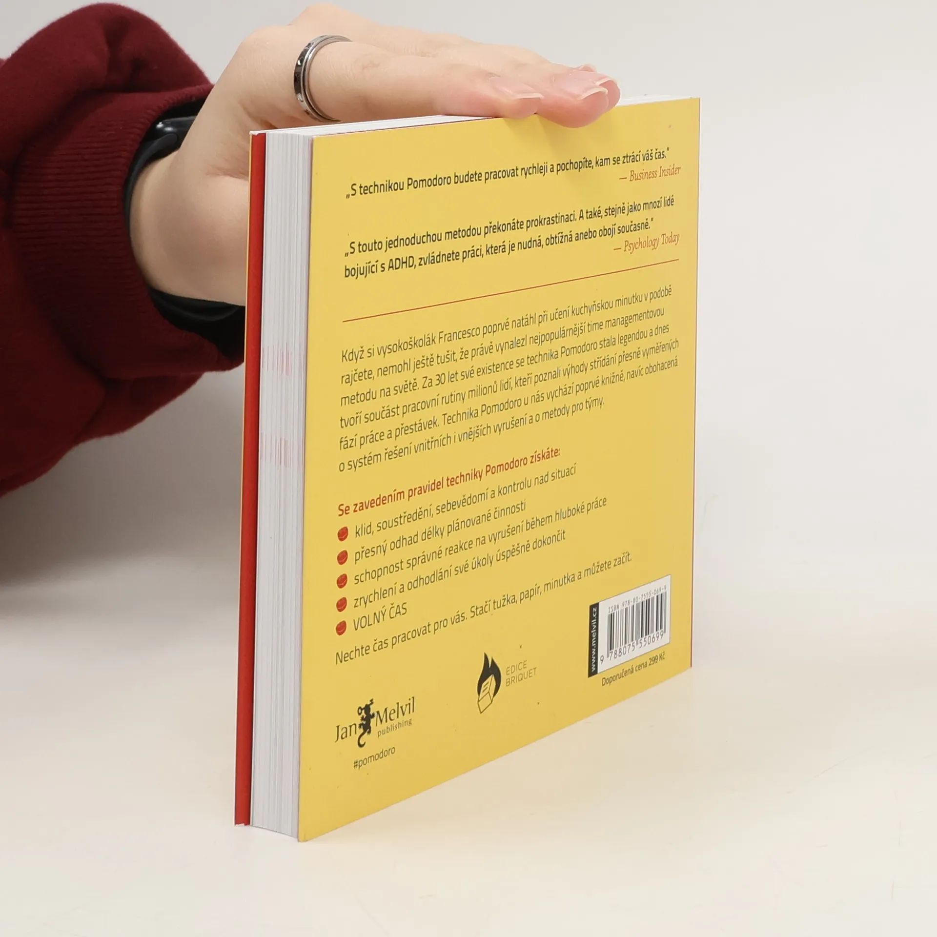 Když si vysokoškolák Francesco poprvé natáhl při učení kuchyňskou minutku v podobě rajčete, nemohl ještě tušit, že právě vynalezl nejpopulárnější time managementovou metodu na světě. Za 30 let své existence se technika Pomodoro stala legendou a dnes tvoří součást pracovní rutiny milionů lidí, kteří poznali výhody střídání přesně vyměřených fází práce a přestávek. Technika Pomodoro u nás vychází poprvé knižně, navíc obohacená o systém řešení vnitřních i vnějších vyrušení a o metody pro týmy. Se zavedením pravidel techniky Pomodoro získáte: klid, soustředění, sebevědomí a kontrolu nad situací - přesný odhad délky plánované činnosti - schopnost správné reakce na vyrušení během hluboké práce - zrychlení a odhodlání své úkoly úspěšně dokončit. Nechte čas pracovat pro vás. Stačí tužka, papír, minutka a můžete začít. Základem techniky Pomodoro jsou pětadvacetiminutové intervaly hluboké práce prokládané krátkými přestávkami. Po každém bloku čtyř odpracovaných Pomodor přichází delší pauza. Součástí metody je však také plánování a průběžné monitorování denních činností, evidence výsledků a zpracování cenné zpětné vazby, kterou si pomocí jednoduchých záznamů můžete poskytovat sami. Kromě zjednodušení pracovních procesů tak díky technice Pomodoro zjistíte, kolik času a úsilí si různé činnosti skutečně žádají, a již nikdy nepadnete do pasti nesplněných termínů.