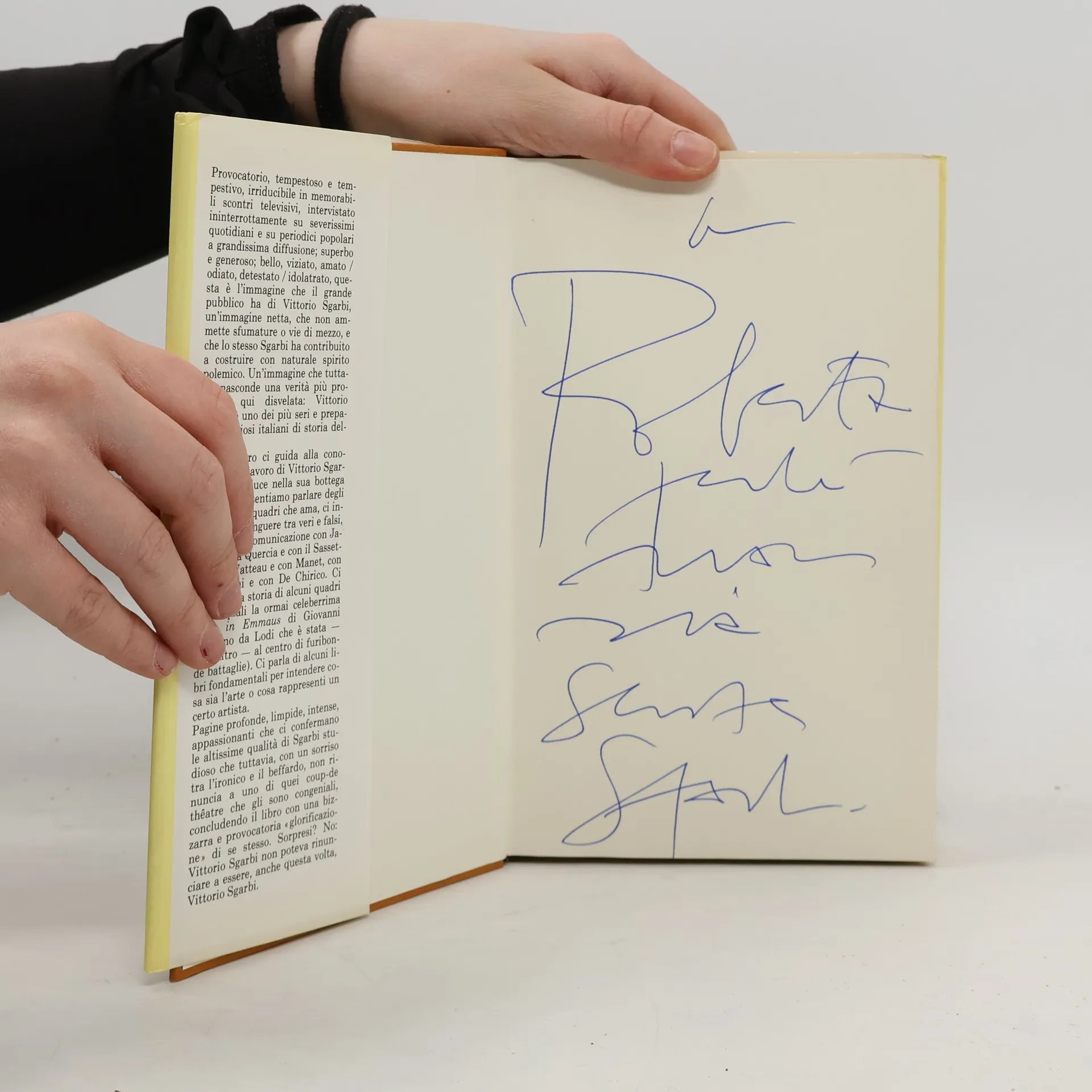 Provocatorio, tempestoso e tempestivo, irriducibile in memorabili scontri televisivi, intervistato ininterrottamente su severissimi quotidiani e su periodici popolari a grandissima diffusione; superbo e generoso; bello, viziato, amato / odiato, detestato / idolatrato, questa è l'immagine che il grande pubblico ha di Vittorio Sgarbi, un'immagine netta, che non ammette sfumature o vie di mezzo, e che lo stesso Sgarbi ha contribuito a costruire con naturale spirito polemico. Un'immagine che tuttavia nasconde una verità più profonda, qui disvelata: Vittorio Sgarbi è uno dei più seri e preparati studiosi italiani di storia dell'arte. Questo libro ci guida alla conoscenza del lavoro di Vittorio Sgarbi, ci introduce nella sua bottega — e così lo sentiamo parlare degli artisti e dei quadri che ama, ci insegna a distinguere tra veri e falsi, ci mette in comunicazione con Jacopo della Quercia e con il Sassetta, con Watteau e con Manet, con Modi gli ani e con De Chirico. Ci racconta la storia di alcuni quadri (fra i quali la ormai celeberrima Cena in Emmaus di Giovanni Agostino da Lodi che è stata — tra l’altro — al centro di furibonde battaglie). Ci parla di alcuni libri fondamentali per intendere cosa sia l'arte o cosa rappresenti un certo artista. Pagine profonde, limpide, intense, appassionanti che ci confermano le altissime qualità di Sgarbi studioso che tuttavia, con un sorriso tra l'ironico e il beffardo, non rinuncia a uno di quei coup-de théatre che gli sono congeniali, concludendo il libro con una bizzarra e provocatoria «glorificazione» di se stesso. Sorpresi? No: Vittorio Sgarbi non poteva rinunciare a essere, anche questa volta, Vittorio Sgarbi.