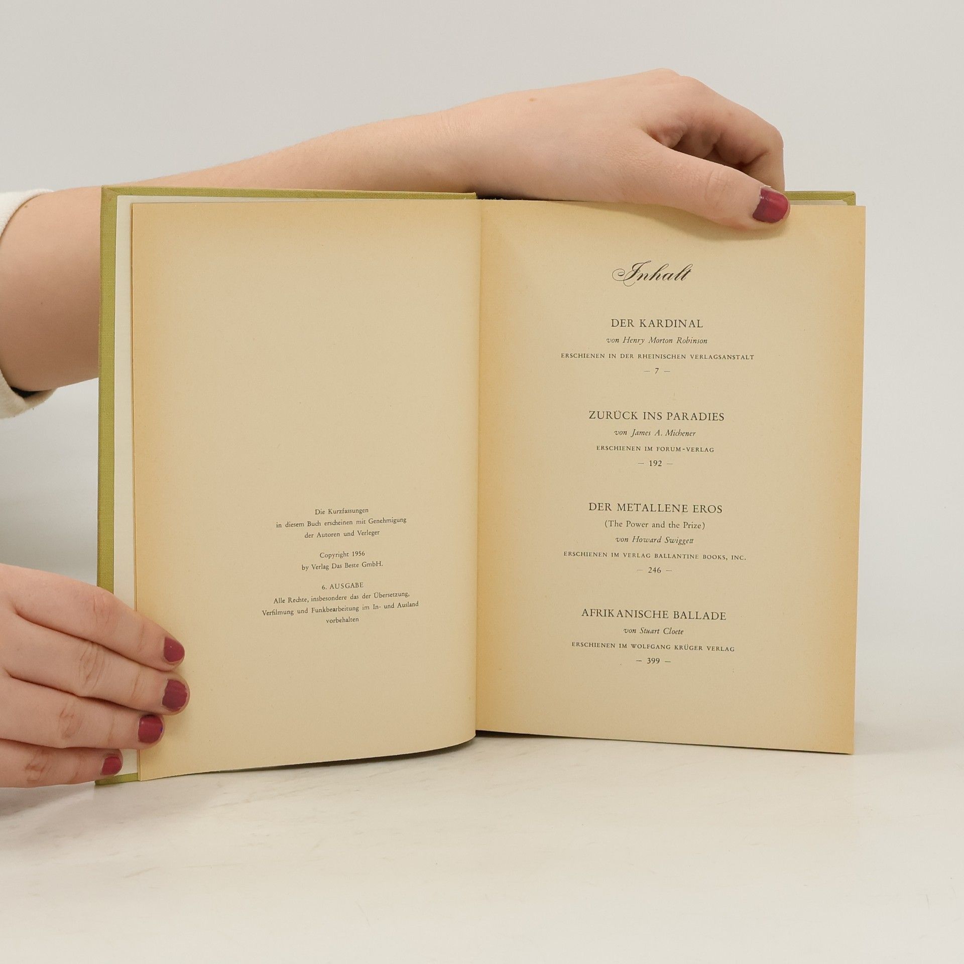 Reader's Digest Auswahlbücher. Der Kardinal. Zurück ins Paradies. Der metallene Eros. Afrikanische Ballade, James Albert Michener, Henry Morton Robinson, Stuart Cloete, Howard Swiggett