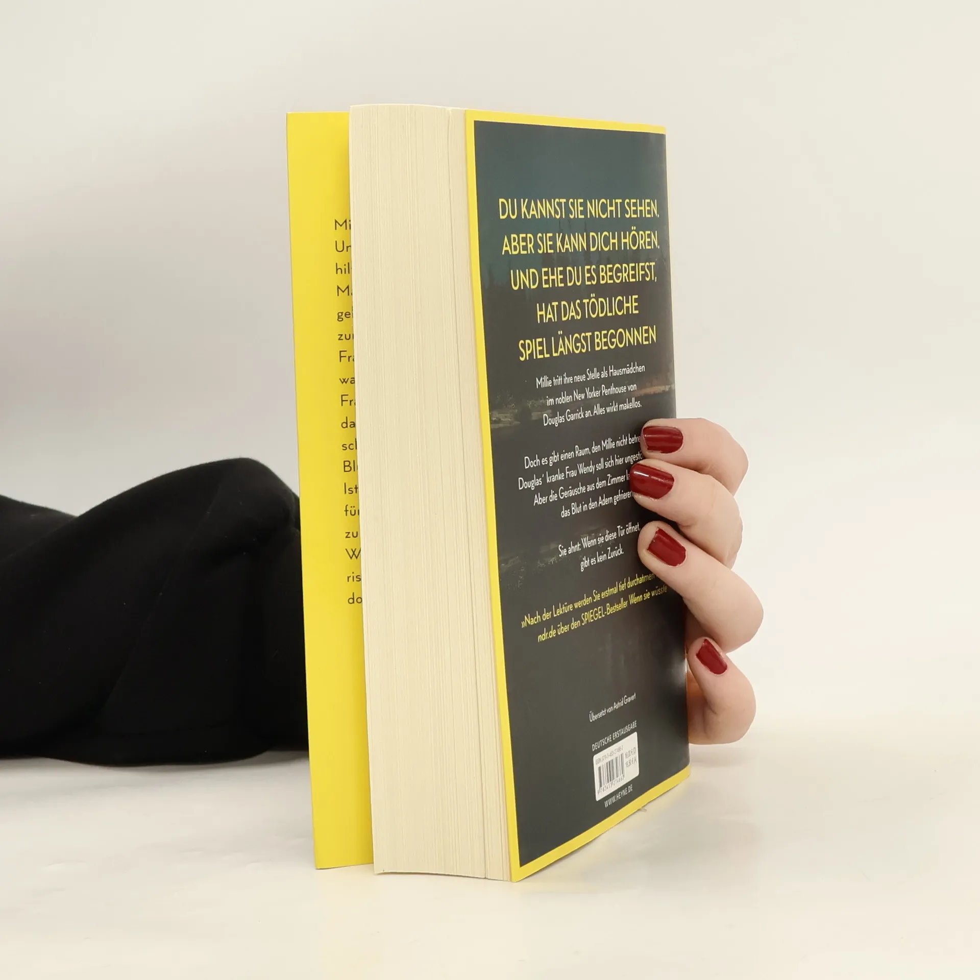Du kannst sie nicht sehen. Aber sie kann dich hören. Und ehe du es begreifst, hat das tödliche Spiel längst begonnen Millie Calloway hat einen neuen Job. Um sich ihr Studium zu finanzieren, hilft sie einem reichen Paar aus Manhattan im Haushalt. Ihr Arbeitgeber Douglas Garrick wirkt nett, und zum Glück stellt er ihr nicht zu viele Fragen zu ihrer Vergangenheit. Doch warum darf Millie nicht mit seiner Frau Wendy sprechen? Was bedeuten das Weinen, das sie aus dem verschlossenen Zimmer hört, und die Blutflecke auf Wendys Kleidung? Ist Douglas in Wahrheit nicht der fürsorgliche Ehemann, der er vorgibt zu sein? Millie weiß nur eins: Sie muss Wendy helfen. Auch wenn sie damit riskiert, dass ihr dunkelstes Geheimnis doch noch ans Licht kommt.