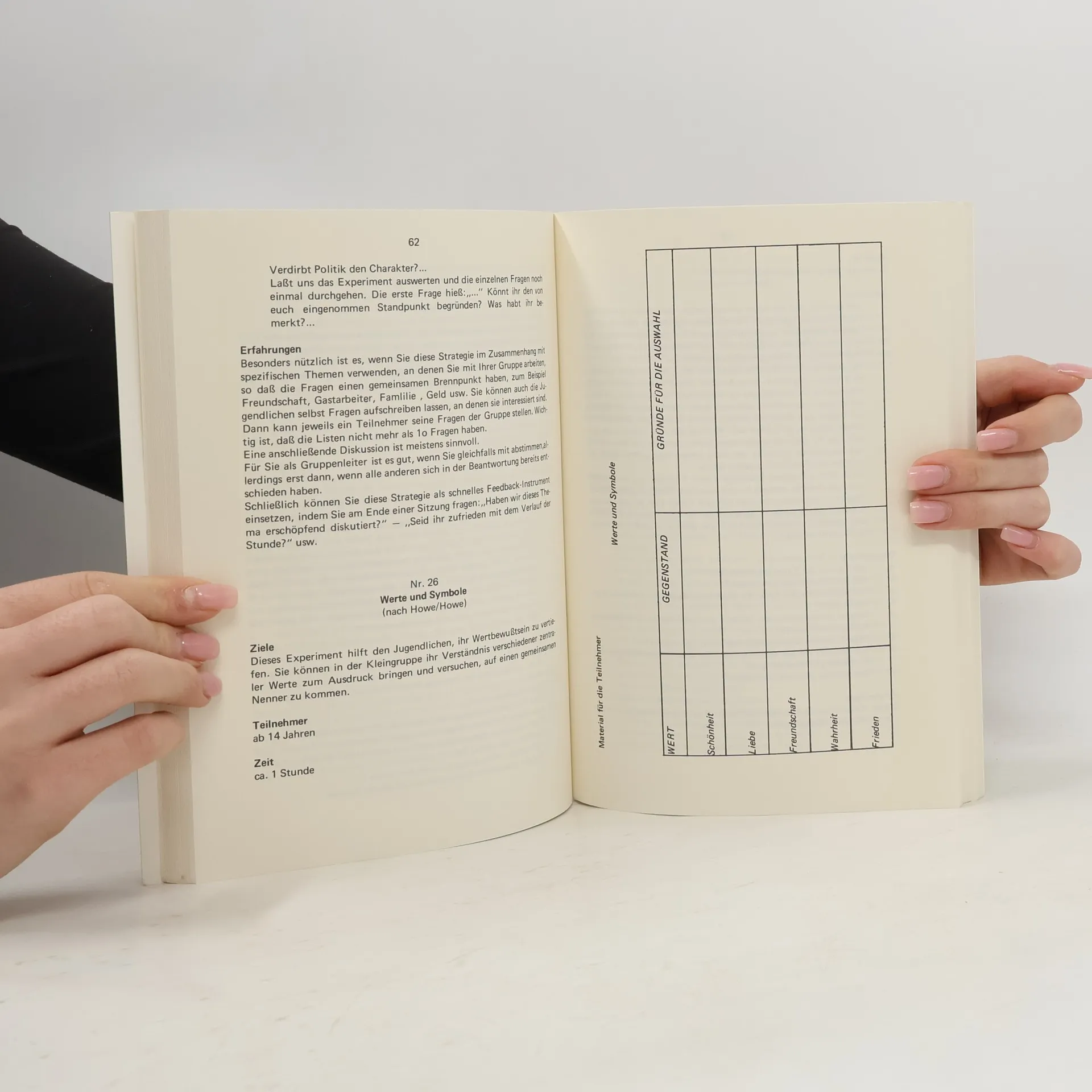 Die Experimente sind so zusammengestellt, daß sie mit Jugendlichen unterschiedlicher sozialer und schulischer Herkunft durchgeführt werden können. Wichtige Lebensthemen kommen zur Sprache, so daß die Jugendlichen ausgiebig Gelegenheit haben, den eigenen Standort mit dem anderer zu vergleichen. Teil 1: Werte, Ziele und Interessen / Schule und Lernen / Arbeit und Freizeit