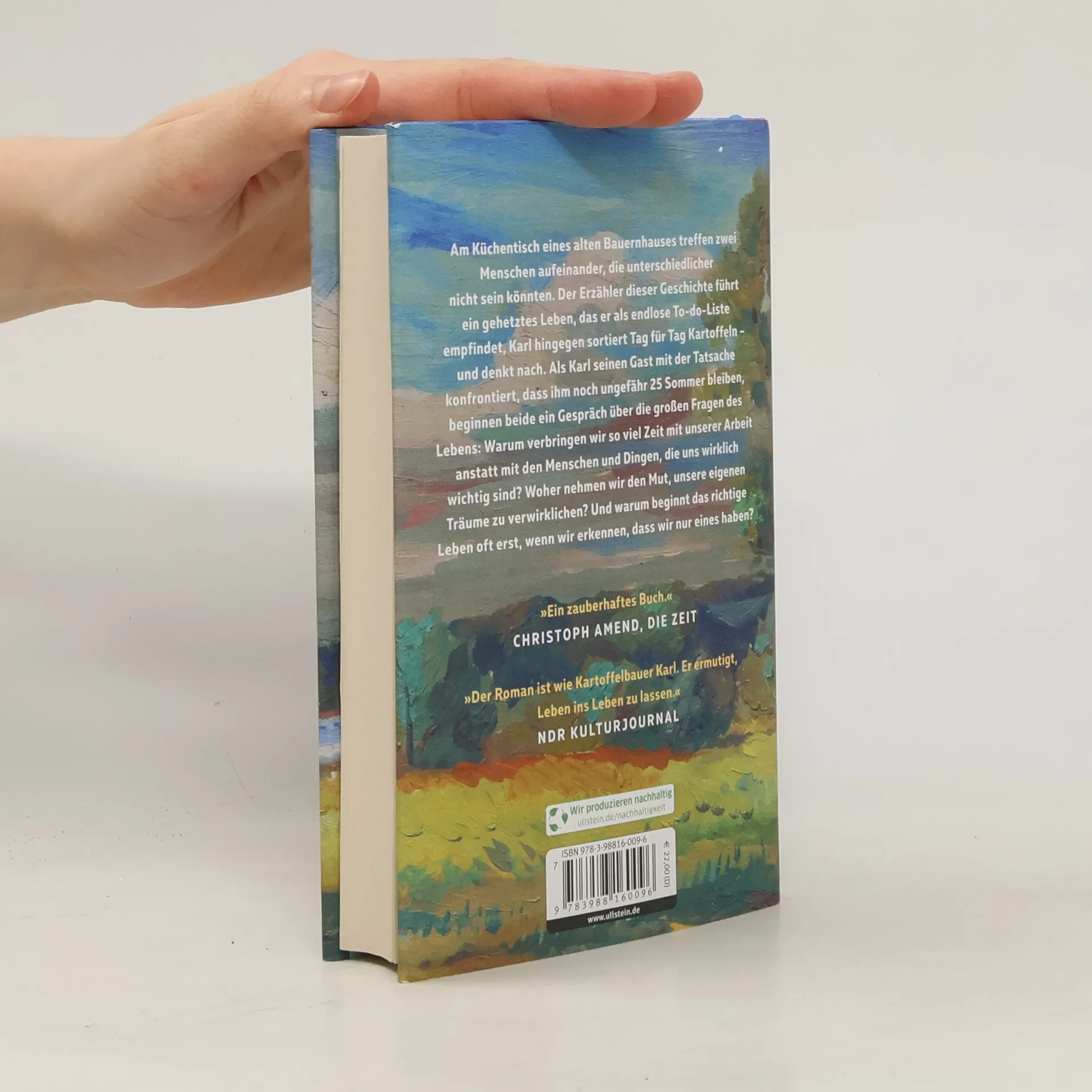 Am Küchentisch eines alten Bauernhauses treffen zwei sehr unterschiedliche Menschen aufeinander. Der Erzähler führt ein gehetztes Leben, das er als endlose To-do-Liste empfindet, während Karl, der Tag für Tag Kartoffeln sortiert, in Ruhe nachdenkt. Als Karl seinem Gast mitteilt, dass ihm noch etwa 25 Sommer bleiben, entfaltet sich ein tiefgründiges Gespräch über die großen Fragen des Lebens: Warum investieren wir so viel Zeit in die Arbeit anstatt in die Menschen und Dinge, die uns wirklich wichtig sind? Woher nehmen wir den Mut, unsere Träume zu verwirklichen? Und warum beginnt das richtige Leben oft erst, wenn wir erkennen, dass wir nur eines haben? Der Autor regt dazu an, Antworten in uns selbst zu suchen. Diese Erzählung ist warm und tiefgründig, sie spricht unsere Sehnsucht nach einem ausgewogenen Leben an und nimmt uns mit zu Karl und seinem Hof, zum See und auf den Kartoffelacker. Es ist eine Geschichte über Freundschaft, über das Zuviel und Zuwenig im Leben und über die Fragen, auf die wir alle Antworten finden möchten. Der Roman ermutigt, das Leben zu leben und vermittelt ein Gefühl der Dankbarkeit für kostbare Momente.