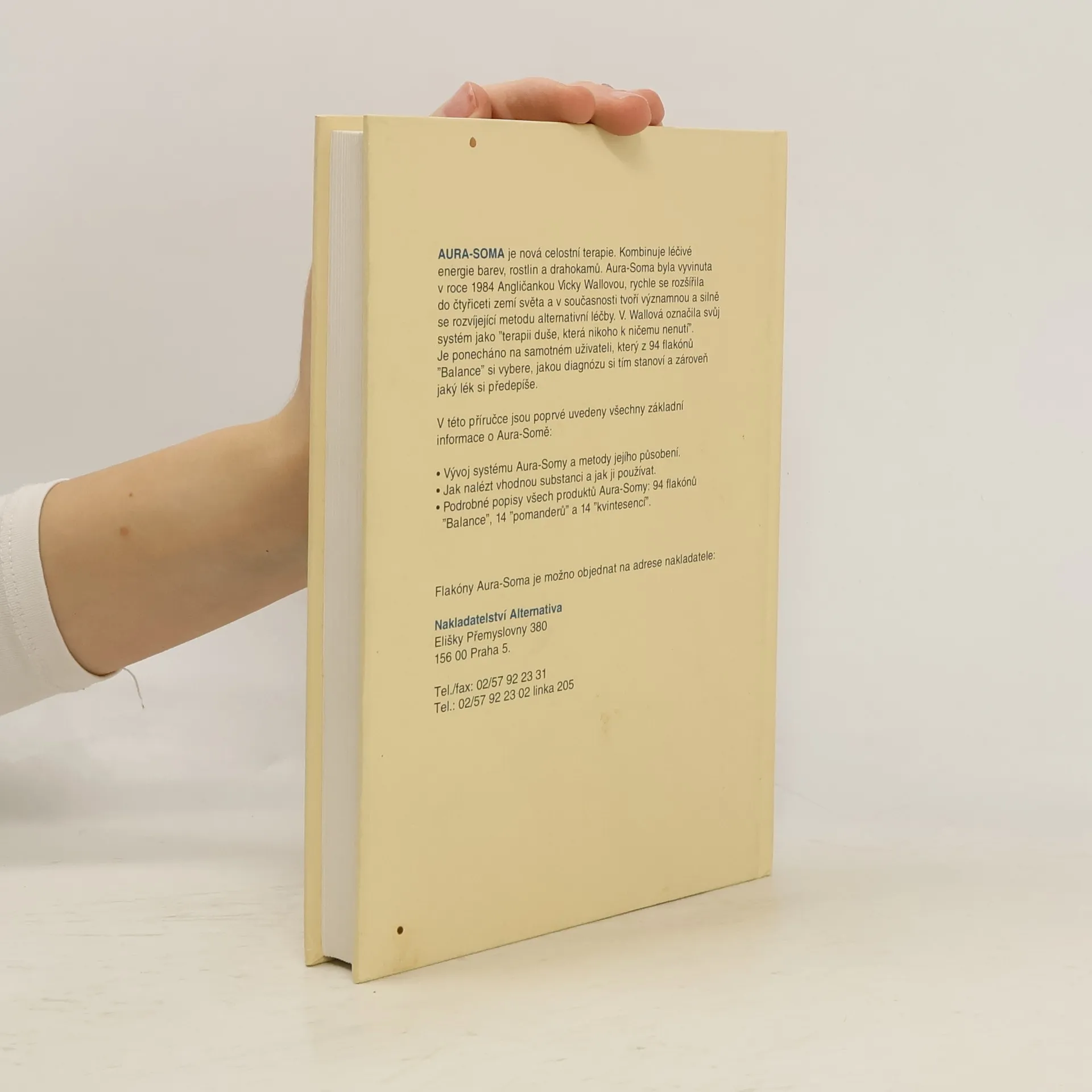 Celostní terapie kombinující léčivé energie barev, rostlin a drahokamů, Aura-Soma, byla vyvinuta Angličankou Vicky Wallovou (1984), rychle se rozšířila do čtyřiceti zemí světa a v současnosti tvoří významnou a silně se rozvíjející metodu alternativní léčby. V. Wallová označila svůj systém jako "terapii duše, která nikoho k ničemu nenutí". Je ponecháno na samotném uživateli, který z 94 flakónů "Balance" si vybere, jakou diagnózu si tím stanoví a zároveň jaký lék si předepíše. Kniha obsahuje všechny základní informace o této terapii (vývoj a metody působení, nalezení a používání vhodné substance): - Vývoj systému Aura-Somy a metody jejího působení. - Jak nalézt vhodnou substanci a jak ji používat. - Podrobné popisy všech produktů Aura-Somy: 94 flakónů "Balance", 14 "pomanderů" a 14 "kvintesencí".