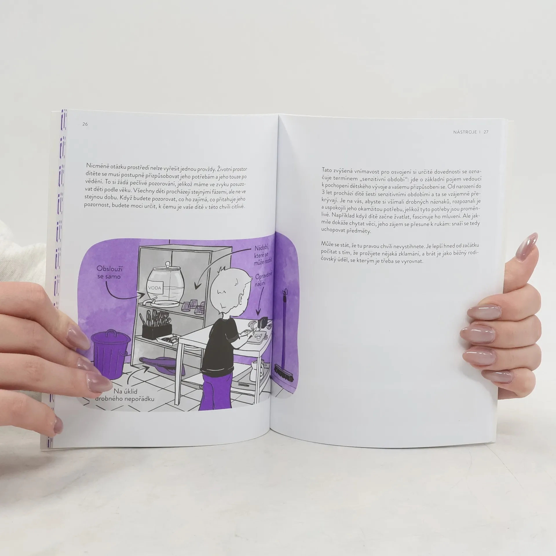 Tato kniha poukazuje na univerzálnost přístupu Montessori, který si mohou ve svých domovech osvojit všichni rodiče, a to bez jakýchkoliv finančních výdajů. Čtenáři zde naleznou základní principy této metody, vyjádřené prostřednictvím četných ukázek praktických příkladů přizpůsobených pokrokům dítěte ve věku od 0 do 3 let. Klíčový pojem "senzitivní období", který je zde vysvětlen a využíván, umožní citlivěji vycházet vstříc potřebám dítěte. Podstatná je jeho spokojenost a možnost plně uplatnit potenciál. Díky respektu a porozumění této bytosti se vytváří mírový svět. O to Maria Montessori usilovala a za to celý svůj život bojovala. Tato kniha se navrací ke kořenům jejího učení.