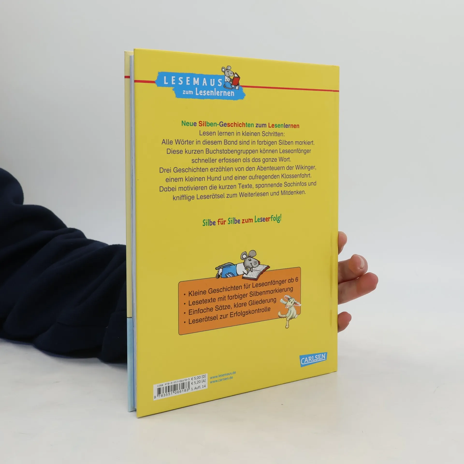 Lesen lernen in kleinen Schritten! Alle Wörter in diesem Band sind in farbigen Silben markiert. Diese kurzen Buchstabengruppen können Leseanfänger schneller erfassen als das ganze Wort. Drei Geschichten erzählen von den Abenteuern der Wikinger, einem kleinen Hund und einer aufregenden Klassenfahrt. Dabei motivieren die kurzen Texte, spannende Sachinfos und knifflige Leserätsel zum Weiterlesen und Mitdenken. Kleine Geschichten für Erstleser ab 6 Lesetexte mit farbiger Silbenmarkierung Einfache Sätze, klare Gliederung Leserätsel zur Erfolgskontrolle Enthält folgende Geschichten: Die Wikinger auf großer Fahrt, Paula und Nele finden einen Hund, Eine Klassenfahrt ans Meer *** LESEMAUS zum LESENLERNEN – die Reihe für Erstleser! *** Spannende und leichte Geschichten für Jungs und Mädchen, lustige Leserätsel und kindgerechte Sachinfos motivieren Leseanfänger zum Weiterlesen und Mitdenken.