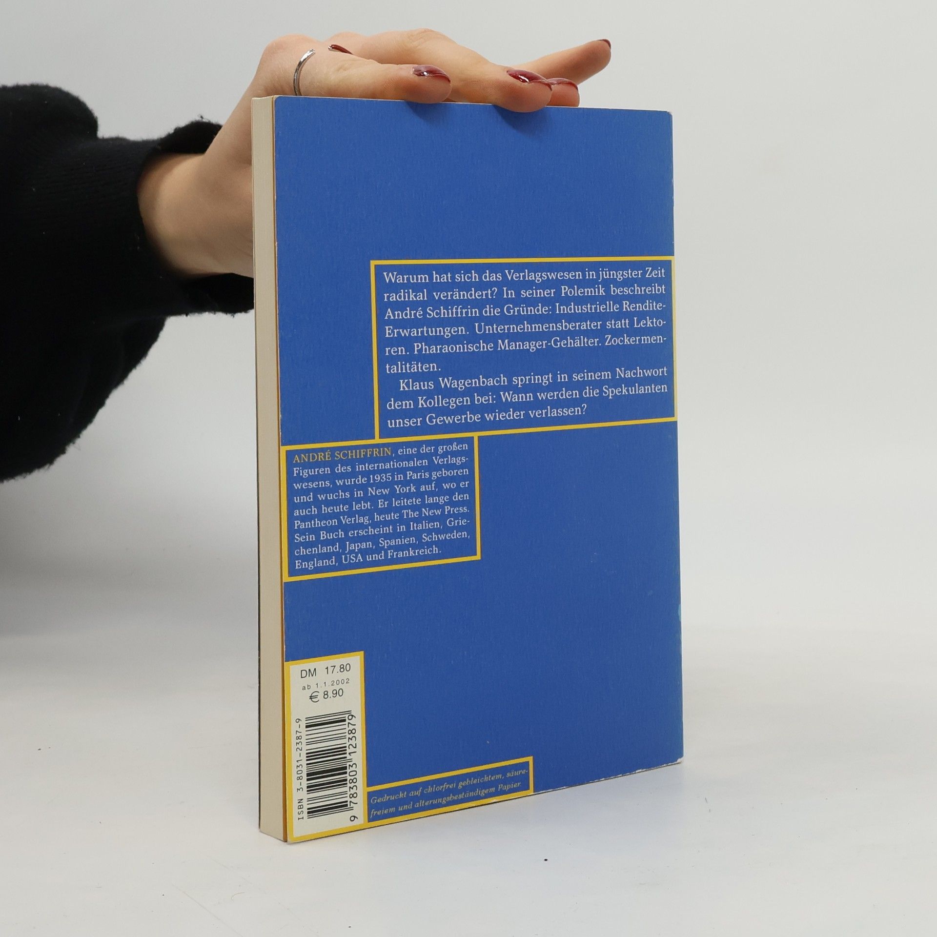 Warum hat sich das Verlagswesen in jüngster Zeit radikal verändert? In seiner Polemik beschreibt André Schiffrin die Gründe: Industrielle Rendite-Erwartungen. Unternehmensberater statt Lektoren. Pharaonische Manager-Gehälter. Zockermentalitäten. Klaus Wagenbach springt in seinem Nachwort dem Kollegen bei: Wann werden die Spekulanten unser Gewerbe wieder verlassen? Warum hat sich das Verlagswesen in den letzten Jahren radikal verändert? In seiner Polemik (die gleichzeitig in neun Ländern erschien) beschreibt Schiffrin die Gründe. Ausgehend von eigenen Erfahrungen im Pantheon Verlag und der Entwicklungen in den USA untersucht er die Ursachen für den Zerfall einer Welt, in der dem Verleger Geschmack und Risiko überlassen worden waren. Die Ursachen sind: keine Querfinanzierung mehr – jedes Buch und jede Abteilung muss profitabel sein. Industrielle Rendite-Erwartungen. Ersetzung der Lektorate durch Marketing-Fachleute. Das Ergebnis ist: Es erscheinen keine Bücher mehr mit einer Auflagenerwartung von weniger als 6.000 bis 10.000 Exemplaren. Das Neue aber – ob in der Politik, Literatur oder Wissenschaft – kommt auf leisen Sohlen und in kleinen Auflagen. Eine moderne Gesellschaft ohne neue Ideen? Ohne unabhängige Verlage entsteht keine Kultur.