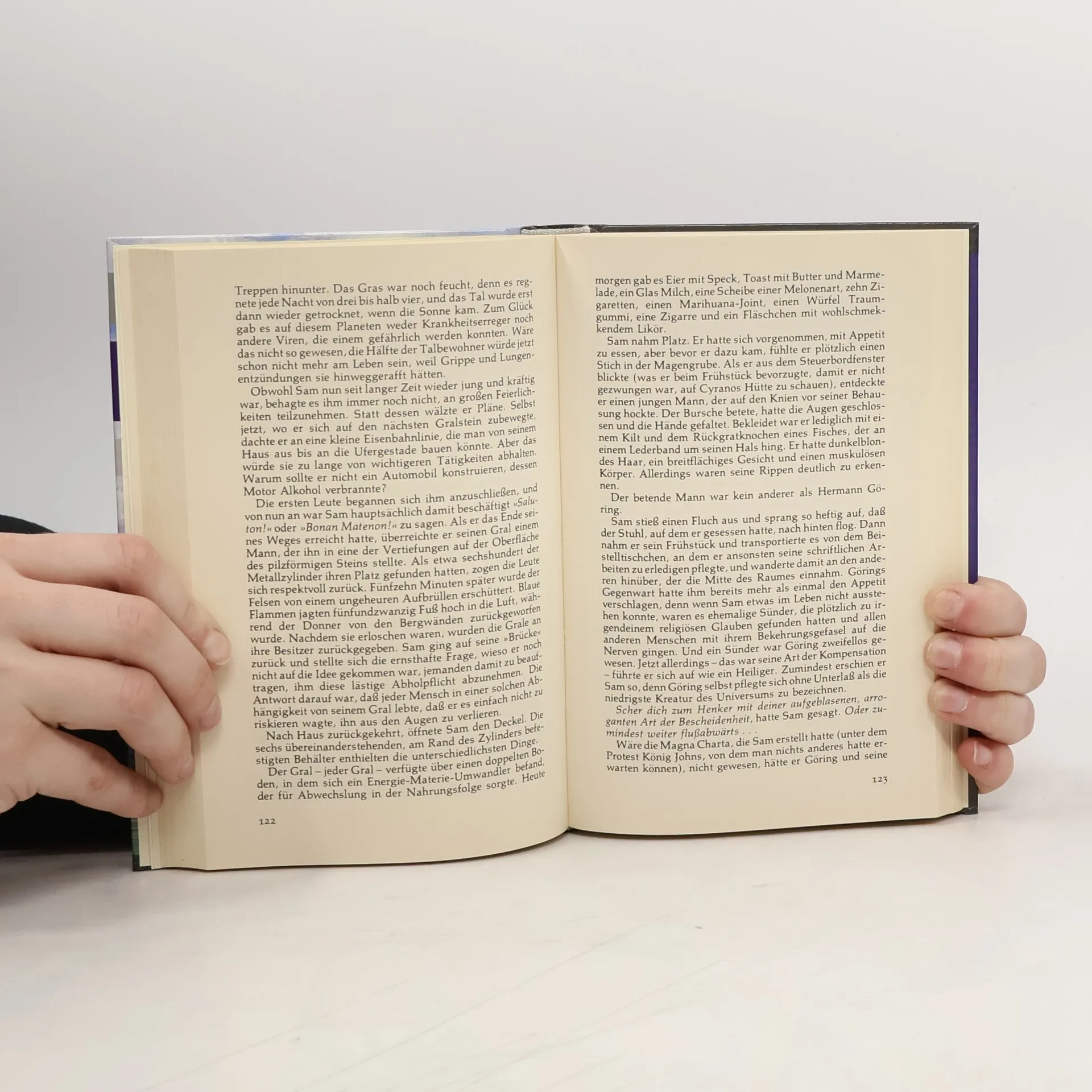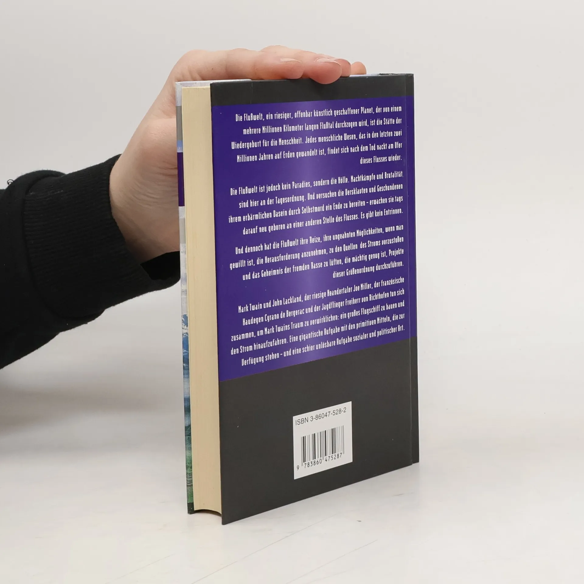 Die Flussweit, ein riesiger, offenbar künstlich geschaffener Planet, der von einem mehrere Millionen Kilometer langen Flusstal durchzogen wird, ist die Stätte der Wiedergeburt für die Menschheit. Jedes menschliche Wesen, das in den letzten zwei Millionen Jahren auf Erden gewandelt ist, findet sich nach dem Tod nackt am Ufer dieses Flusses wieder. Die Flussweit ist jedoch kein Paradies, sondern die Hölle. Machtkämpfe und Brutalität feiern fröhliche Urständ. Und versuchen die Versklavten und Geschundenen ihrem erbärmlichen Dasein durch Selbstmord ein Ende zu bereiten - erwachen sie tags darauf neu geboren an einer anderen Stelle des Flusses. Es gibt kein Entrinnen. Und dennoch hat die Flussweit ihre Reize, ihre ungeahnten Möglichkeiten, wenn man gewillt ist, die Herausforderung anzunehmen, zu den Quellen des Stroms vorzustoßen und das Geheimnis der fremden Rasse zu lüften, die mächtig genug ist, Projekte dieser Größenordnung durchzuführen. Mark Twain und John Lackland, der riesige Neandertaler Joe Miller, der französische Haudegen Cyrano de Bergerac und der Jagdflieger Freiherr von Richthofen tun sich zusammen, um Mark Twains Traum zu verwirklichen: ein großes Flußschiff zu bauen und den Strom hinaufzufahren. Eine gigantische Aufgabe mit den primitiven Mitteln, die zur Verfügung stehen - und eine schier unlösbare Aufgabe sozialer und politischer Art.