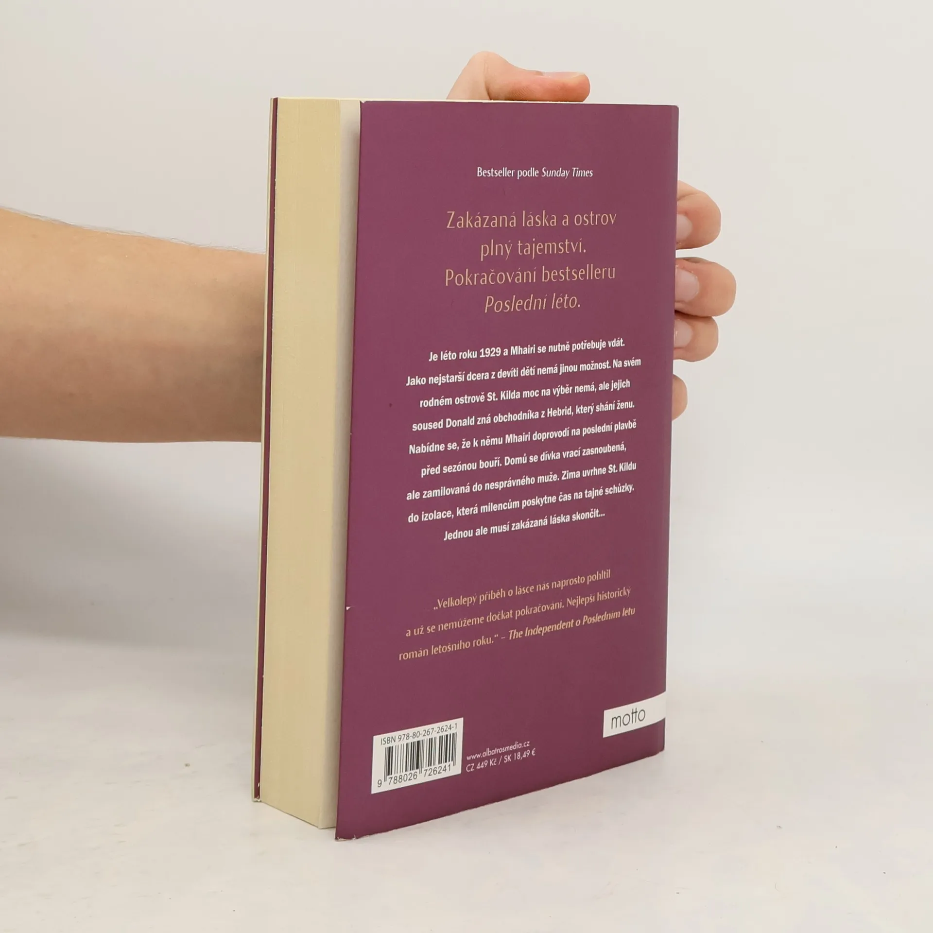 Zakázaná láska a ostrov plný tajemství. Pokračování bestselleru Poslední léto. Je léto roku 1929 a Mhairi se nutně potřebuje vdát. Jako nejstarší dcera z devíti dětí nemá jinou možnost. Na svém rodném ostrově St. Kilda moc na výběr nemá, ale jejich soused Donald zná obchodníka z Hebrid, který shání ženu. Nabídne se, že k němu Mhairi doprovodí na poslední plavbě před sezónou bouří. Domů se dívka vrací zasnoubená, ale zamilovaná do nesprávného muže. Zima uvrhne St. Kildu do izolace, která milencům poskytne čas na tajné schůzky. Jednou ale musí zakázaná láska skončit