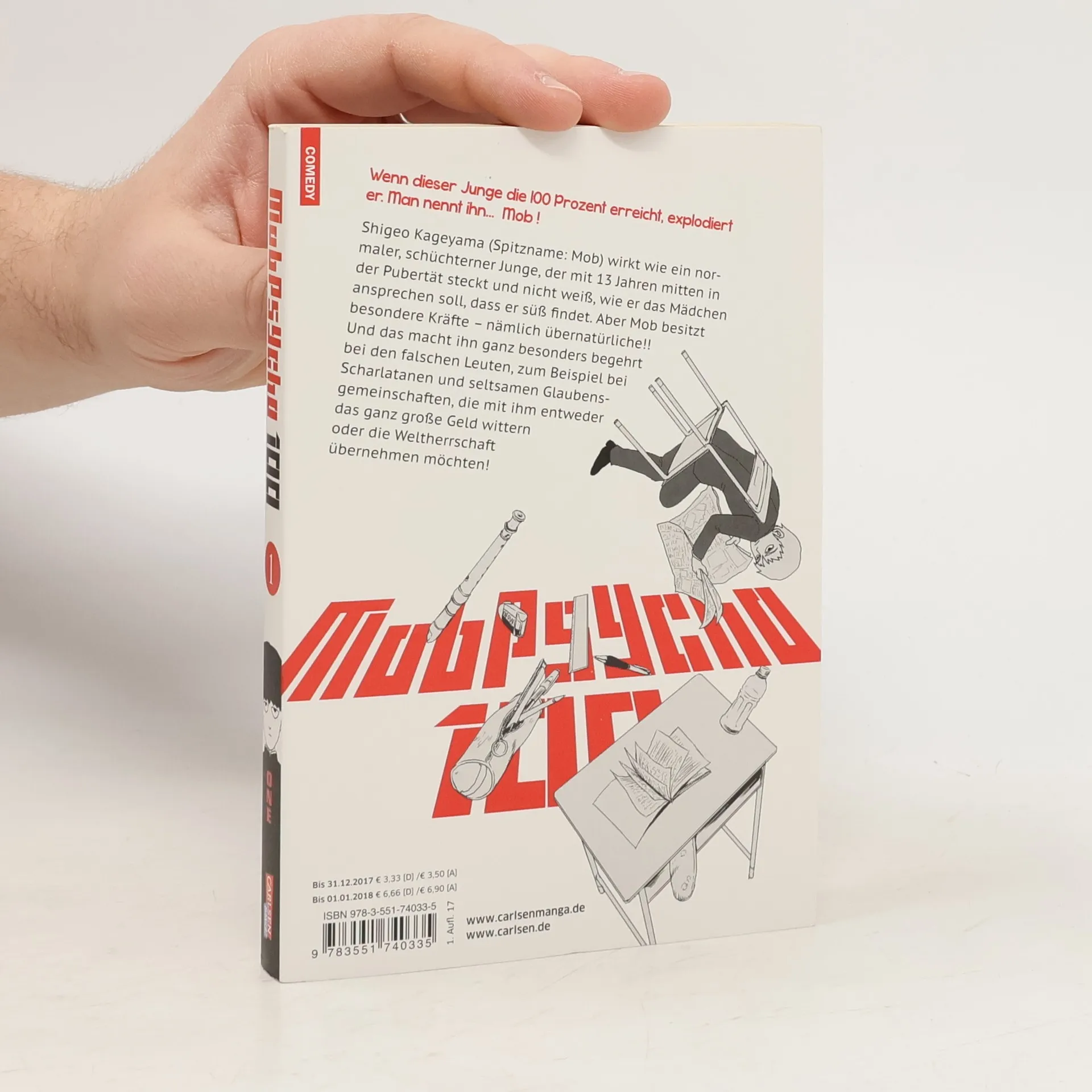 Exorzisten, Geister und jede Menge Humor Shigeo Kageyama, bekannt als Mob, ist ein scheinbar unscheinbarer Schüler mit einer besonderen Gabe: Er hat unglaubliche psychische Kräfte. Als Praktikant eines stadtbekannten Exorzisten darf er seinem Chef regelmäßig aus der Patsche helfen. Dabei trifft er auf die seltsamsten Geister, die den Menschen das Leben zur Hölle machen. Er würde gerne ein normales Leben führen – doch Hausarrest, Taschengeldabzug für Uri-Geller-Löffel-Verbiegen™ und allein der Anblick seines Schwarms bringen seine Emotionen zum Brodeln. Und wenn sein inneres Emo-Meter überkocht und die „100“ übersteigt, geschieht Schreckliches! Abgeschlossen in 16 Bänden Der Manga zum Anime-Hit auf Crunchyroll und Netflix Für Fans von „My Hero Academia“, „Dr. Stone“ und „Eden’s Zero“ Ideal für Jungs, Mädchen und alle Geschlechter ab 14 Jahren Exorzisten-Alarm trifft skurrile Comedy: Eine herrlich schräge Manga-Serie voller Action, Drama und Teenagerproblemen