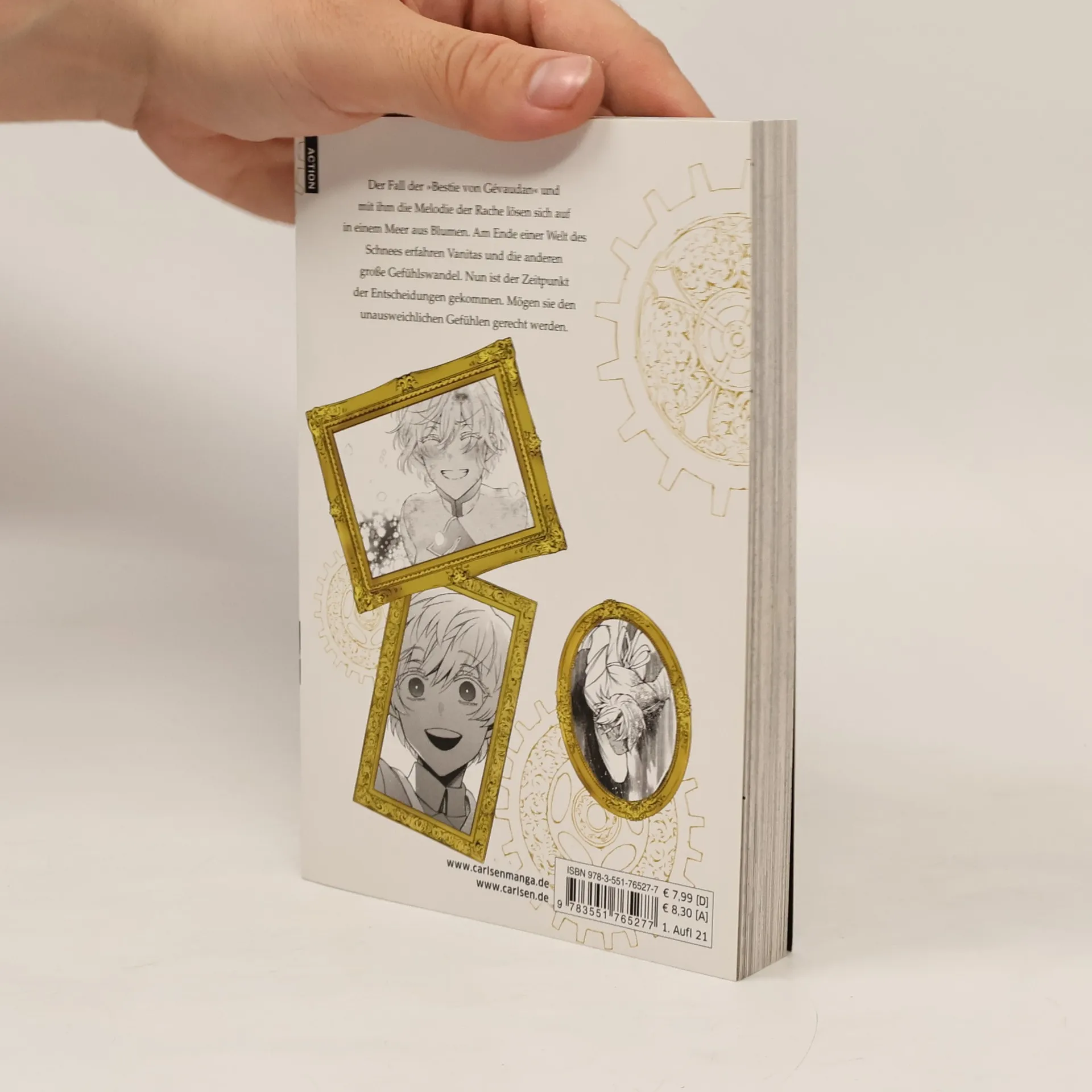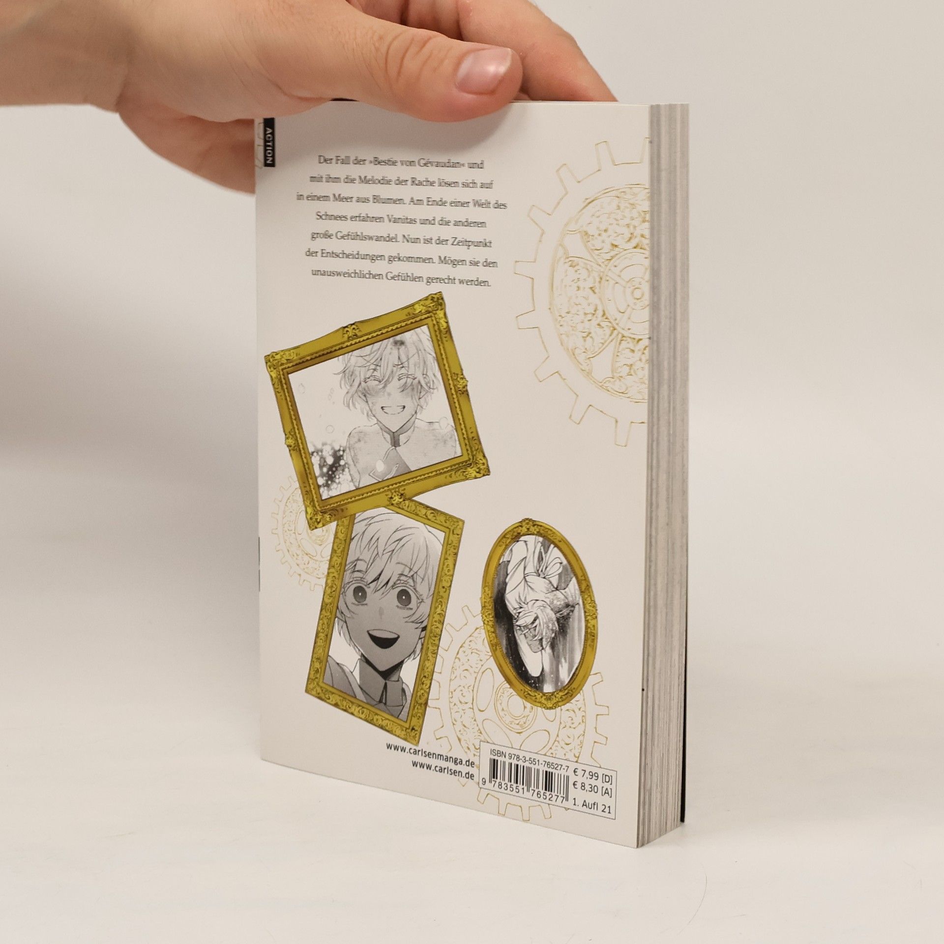 »Ich werde die Vampire retten!« Der Fall der »Bestie von Gévaudan« und mit ihm die Melodie der Rache lösen sich auf in einem Meer aus Blumen. Am Ende einer Welt des Schnees erfahren Vanitas und die anderen große Gefühlswandel. Nun ist der Zeitpunkt der Entscheidungen gekommen. Mögen sie den unausweichlichen Gefühlen gerecht werden. Jun Mochizuki zeigt ihren Lesern eine aufregende Steampunk-Fantasywelt, mit ihrem detaillierten Artwork wunderbar zum Leben erweckt. Atemberaubende Zeichnungen von der Schöpferin des Bestseller-Manga »PandoraHearts« Die Serie gilt als noch nicht abgeschlossen Empfohlen für Leser*innen ab 14 Jahren Anime-Adaption auf Crunchyroll Dies ist Band 8 der Serie. Spannende Steampunk-Geschichte über ein mystisches Buch und einen gefährlichen Fluch – Für Fans von actiongeladenen Fantasywelten mit Biss!