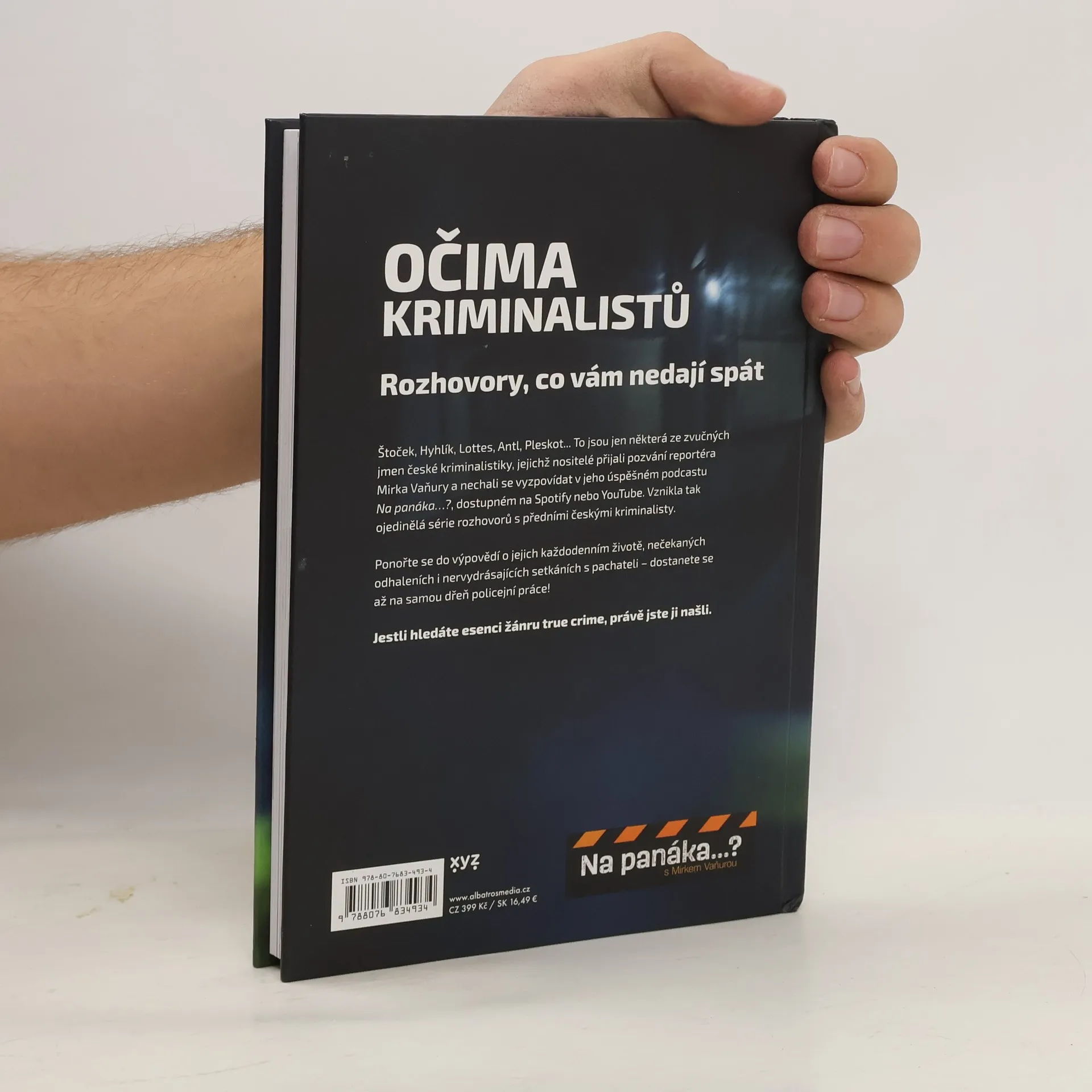 Na panáka s legendami české kriminalistiky. Rozhovory, co vám nedají spát. Štoček, Hyhlík, Lottes, Antl, Pleskot... To jsou jen některá ze zvučných jmen české kriminalistiky, jejichž nositelé přijali pozvání reportéra Mirka Vaňury a nechali se vyzpovídat v jeho úspěšném podcastu Na panáka? Vznikla tak ojedinělá série rozhovorů s předními českými kriminalisty. Ponořte se do výpovědí o jejich každodenním životě, nečekaných odhaleních i nervydrásajících setkáních s pachateli – dostanete se až na samou dřeň policejní práce! Jestli hledáte esenci žánru true crime, právě jste ji našli. Kniha Očima kriminalistů však tento žánr v mnohém přesahuje. Čtenář se mimo jiné dozví, jak se jednotliví respondenti staví k rozsáhlé ammnestii vyhlášené prezidentem Václavem Havlem na Nový rok 1990 a následnému rapidnímu nárůstu kriminality. Podobně výbušných témat se napříč rozhovory táhne několik, a ty tak ve svém celku podávají komplexní zprávu o srování předlistopadové a pozdější kriminalistiky. Mirek Vaňura využívá osobní známosti se zpovídanými legendami svých oborů k tomu, aby se mu otevřely víc, než bývá zvykem.