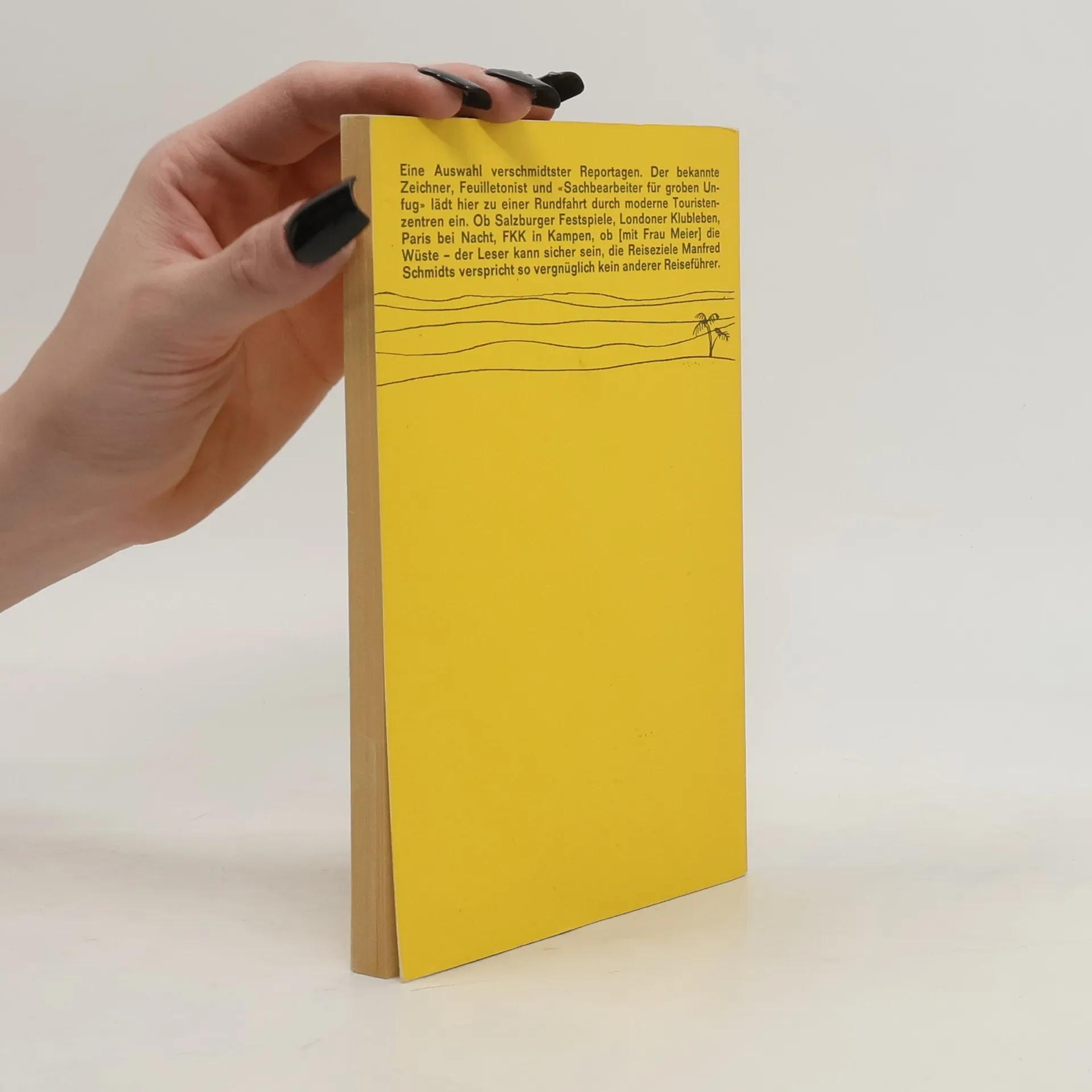 Eine Auswahl verschmidtster Reportagen. Der bekannte Zeichner, Feuilletonist und "Sachbearbeiter für groben Unfug" lädt hier zu einer Rundfahrt durch moderne Touristenzentren ein. Ob Salzburger Festspiele, Londoner Klubleben, Paris bei Nacht, FKK in Kampen, ob (mit Frau Meier) die Wüste - der Leser kann sicher sein, die Reiseziele Manfred Schmidts verspricht so vergnüglich kein anderer Reiseführer.
