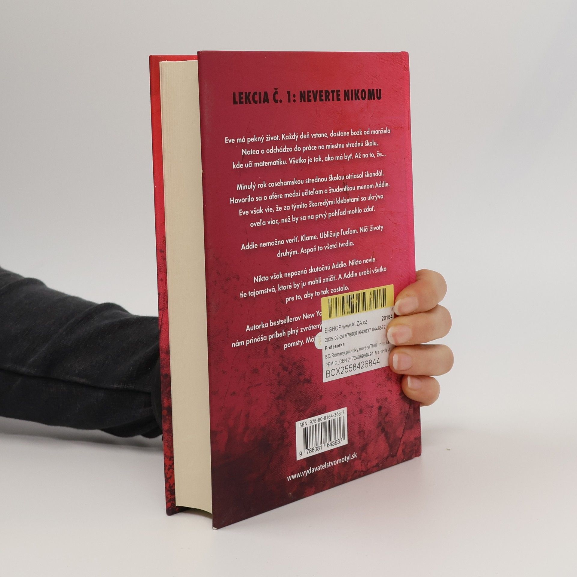 Eve má pekný život. Každý deň vstane, dostane bozk od manžela Natea a odchádza do práce na miestnu strednú školu, kde učí matematiku. Všetko je tak, ako má byť. Až na to, že... Minulý rok casehamskou strednou školou otriasol škandál. Hovorilo sa o afére medzi učiteľom a študentkou menomAddie. Eve však vie, že za týmito škaredými klebetami sa ukrýva oveľa viac, než by sa na prvý pohľad mohlo zdať. Addie nemožno veriť. Klame. Ubližuje ľuďom. Ničí životy druhým. Aspoň to všetci tvrdia. Nikto však nepozná skutočnú Addie. Nikto nevie tie tajomstvá, ktoré by ju mohli zničiť. A Addie urobí všetko pre to, aby to tak zostalo. Autorka bestsellerov New York Times Freida McFadden nám prináša príbeh plný zvrátených tajomstiev a dlho očakávanej pomsty. Máte sa na čo tešiť.