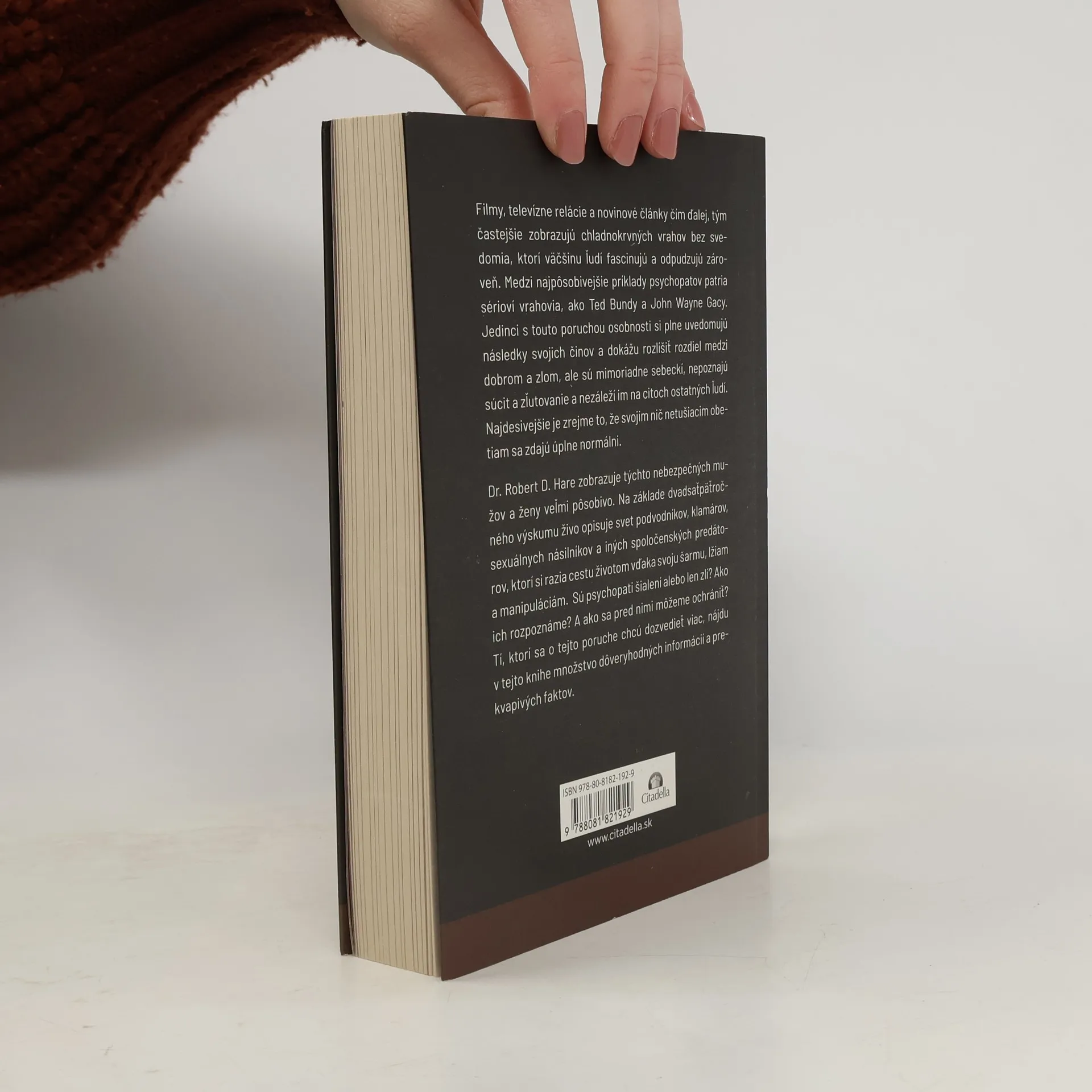 Filmy, televízne relácie a novinové články čím ďalej, tým častejšie zobrazujú chladnokrvných vrahov bez svedomia, ktorí väčšinu ľudí fascinujú a odpudzujú zároveň. Medzi najpôsobivejšie príklady psychopatov patria sérioví vrahovia ako Ted Bundy a John Wayne Gacy. Jedinci s touto poruchou osobnosti si plne uvedomujú následky svojich činov a dokážu rozlíšiť rozdiel medzi dobrom a zlom, ale sú mimoriadne sebeckí, nepoznajú súcit a zľutovanie a nezáleží im na citoch ostatných ľudí. Najdesivejšie je zrejme to, že svojim nič netušiacim obetiam sa zdajú úplne normálni. Autor zobrazuje týchto nebezpečných mužov a ženy veľmi pôsobivo. Na základe dvadsaťpäťročného výskumu živo opisuje svet podvodníkov, klamárov, sexuálnych násilníkov a iných spoločenských predátorov, ktorí si razia cestu životom vďaka svoju šarmu, lžiam a manipuláciám. Sú psychopati šialení alebo len zlí? Ako ich rozpoznáme? A ako sa pred nimi môžeme ochrániť? Tí, ktorí sa o tejto poruche chcú dozvedieť viac, nájdu v tejto knihe množstvo dôveryhodných informácií a prekvapivých faktov. Kapitoly: Stretnutie s psychopatom, Čo to znamená, Profil: pocity a vzťahy, Profil: životný štýl, Vnútorná kontrola: chýbajúci článok, Zločin: logická voľba, Psychopati v oblekoch, Slová z vrecka kabáta, Muchy v pavučine, Korene problému, Etické problémy diagnózy, Čo môžeme urobiť, Návod na prežitie.