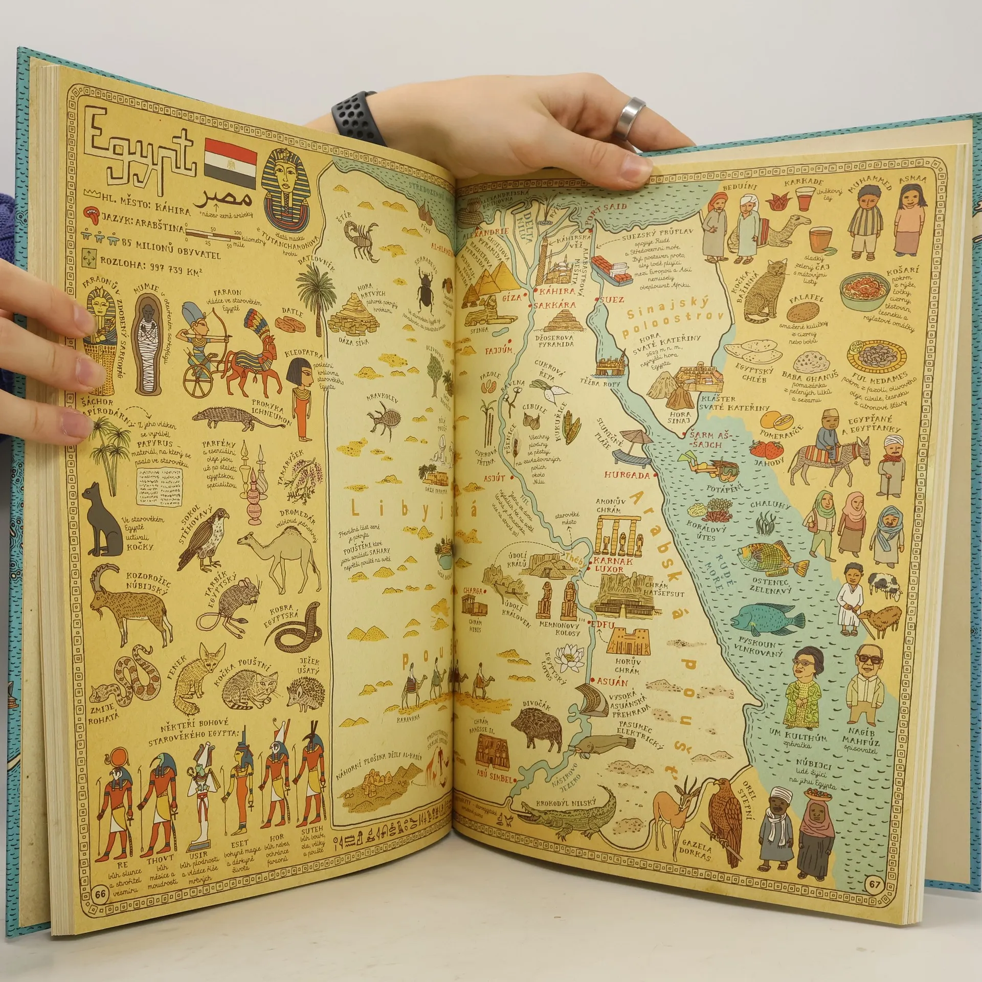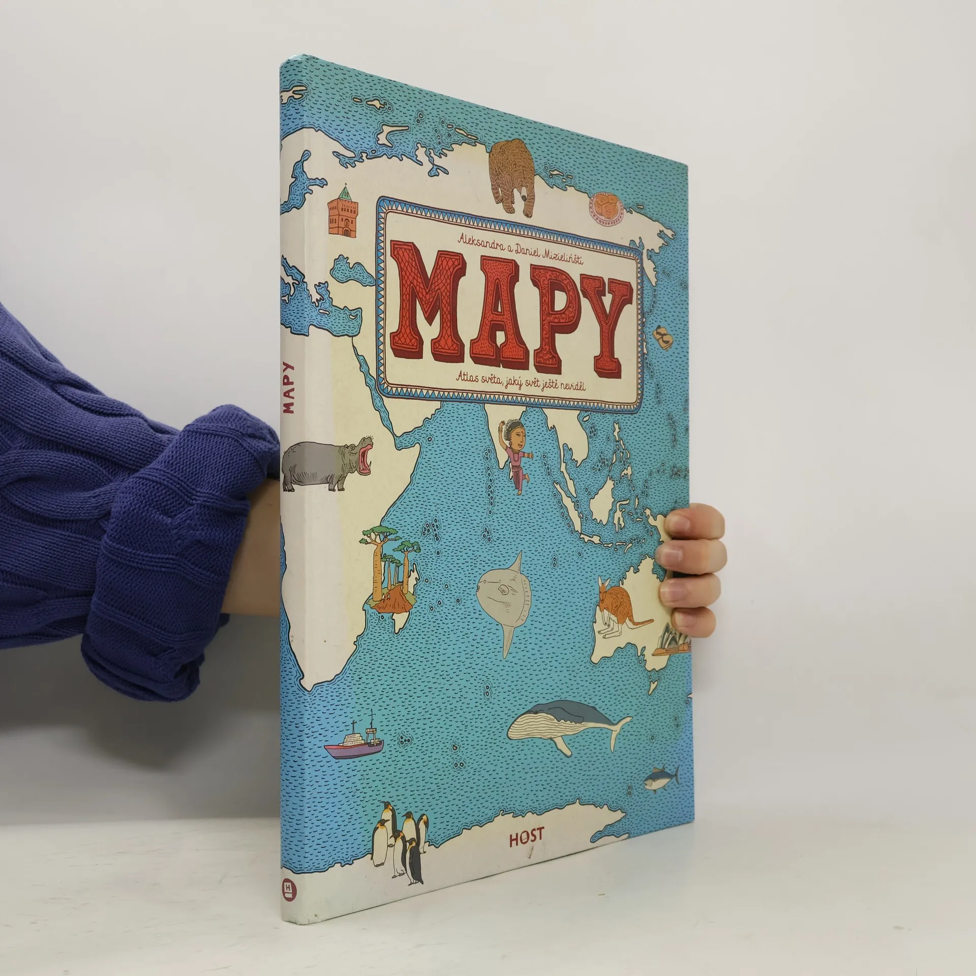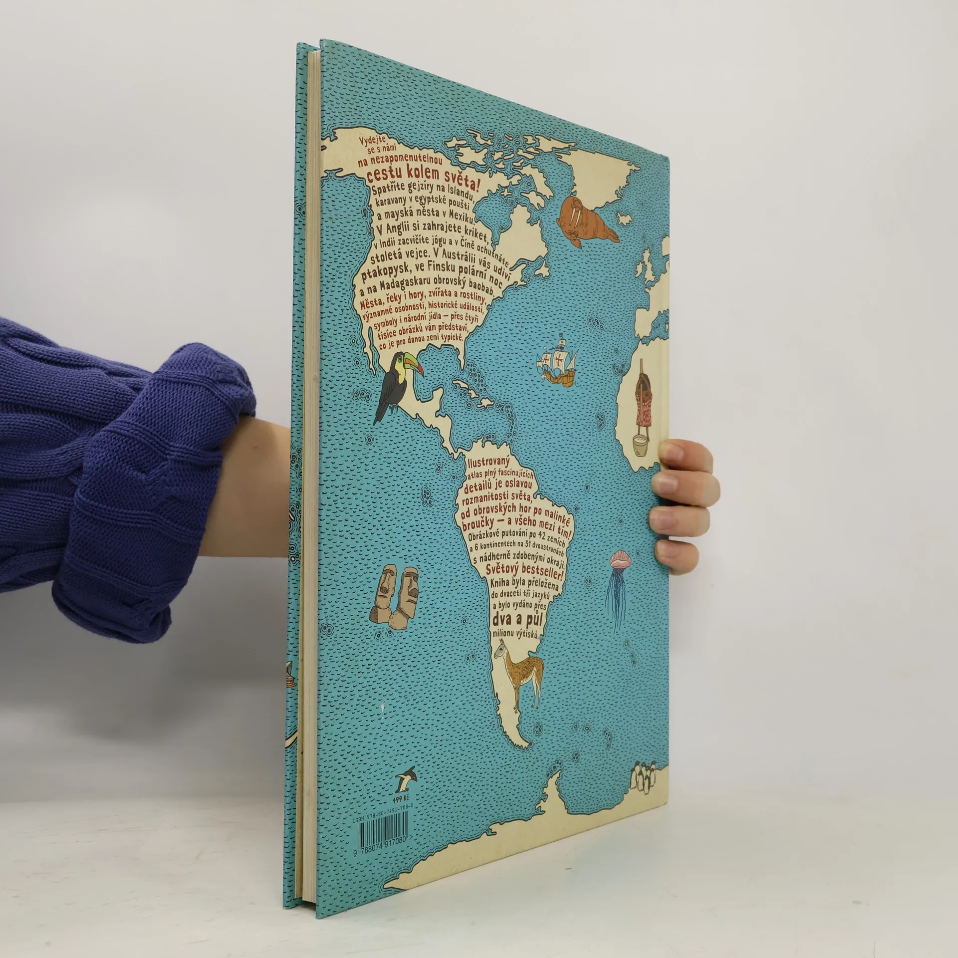 Vydejte se s námi na nezapomenutelnou cestu kolem světa... Spatříte gejzíry na Islandu, karavany v egyptské poušti a mayská města v Mexiku. V Anglii si zahrajete kriket, v Indii zacvičíte jógu a v Číně ochutnáte stoletá vejce. V Austrálii vás udiví ptakopysk, ve Finsku polární noc a na Madagaskaru obrovský baobab. Města, řeky i hory, zvířata a rostliny, významné osobnosti, historické události, symboly i národní jídla — přes čtyři tisíce obrázků vám představí, co je pro danou zemi typické. Obrázkové putování po dvaačtyřiceti zemích a šesti kontinentech na jednapadesáti dvoustranách s nádherně zdobenými okraji, které připomínají mapy dávných objevitelů a mořeplavců. Ilustrovaný atlas plný fascinujících detailů je oslavou rozmanitosti světa, od obrovských hor po malinké broučky — a všeho mezi tím. Atlas světa, jaký svět ještě neviděl!