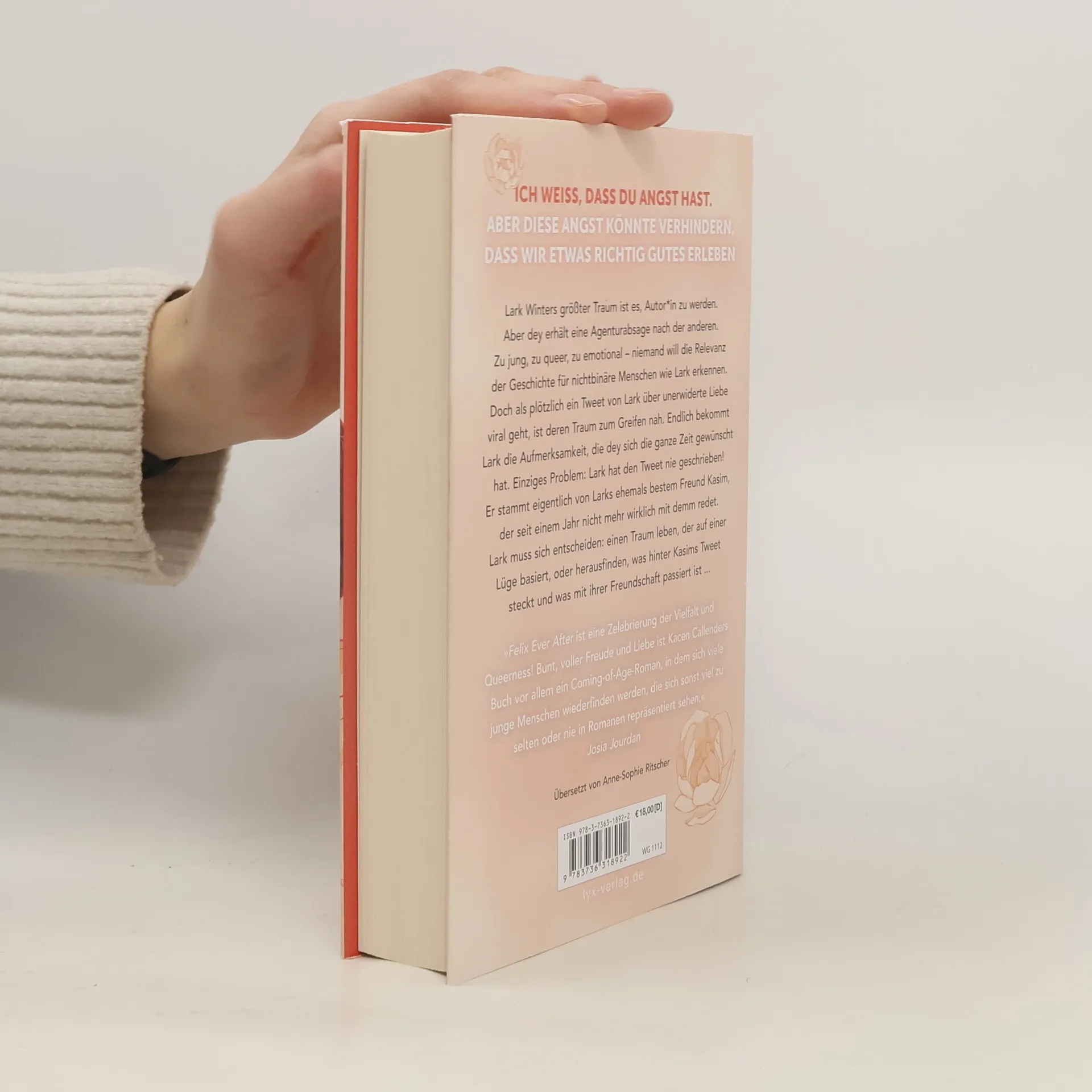 „Ich weiß, dass du Angst hast. Aber diese Angst könnte verhindern, dass wir etwas richtig Gutes erleben“ Lark Winters größter Traum ist es, Autor*in zu werden. Aber dey erhält eine Agenturabsage nach der anderen. Zu jung, zu queer, zu emotional - niemand will die Relevanz der Geschichte für nichtbinäre Menschen wie Lark erkennen. Doch als plötzlich ein Tweet von Lark über unerwiderte Liebe viral geht, ist deren Traum zum Greifen nah. Endlich bekommt Lark die Aufmerksamkeit, die dey sich die ganze Zeit gewünscht hat. Einziges Problem: Lark hat den Tweet nie geschrieben! Er stammt eigentlich von Larks ehemals bestem Freund Kasim, der seit einem Jahr nicht mehr wirklich mit demm redet. Lark muss sich entscheiden: einen Traum leben, der auf einer Lüge basiert, oder herausfinden, was hinter Kasims Tweet steckt und was mit ihrer Freundschaft passiert ist ... „ FELIX EVER AFTER ist eine Zelebrierung der Vielfalt und Queerness! Bunt, voller Freude und Liebe ist Kacen Callenders Buch vor allem ein Coming-of-Age-Roman, in dem sich viele junge Menschen wiederfinden werden, die sich sonst viel zu selten oder nie in Romanen repräsentiert sehen.“ JOSIA JOURDAN über FELIX EVER AFTER