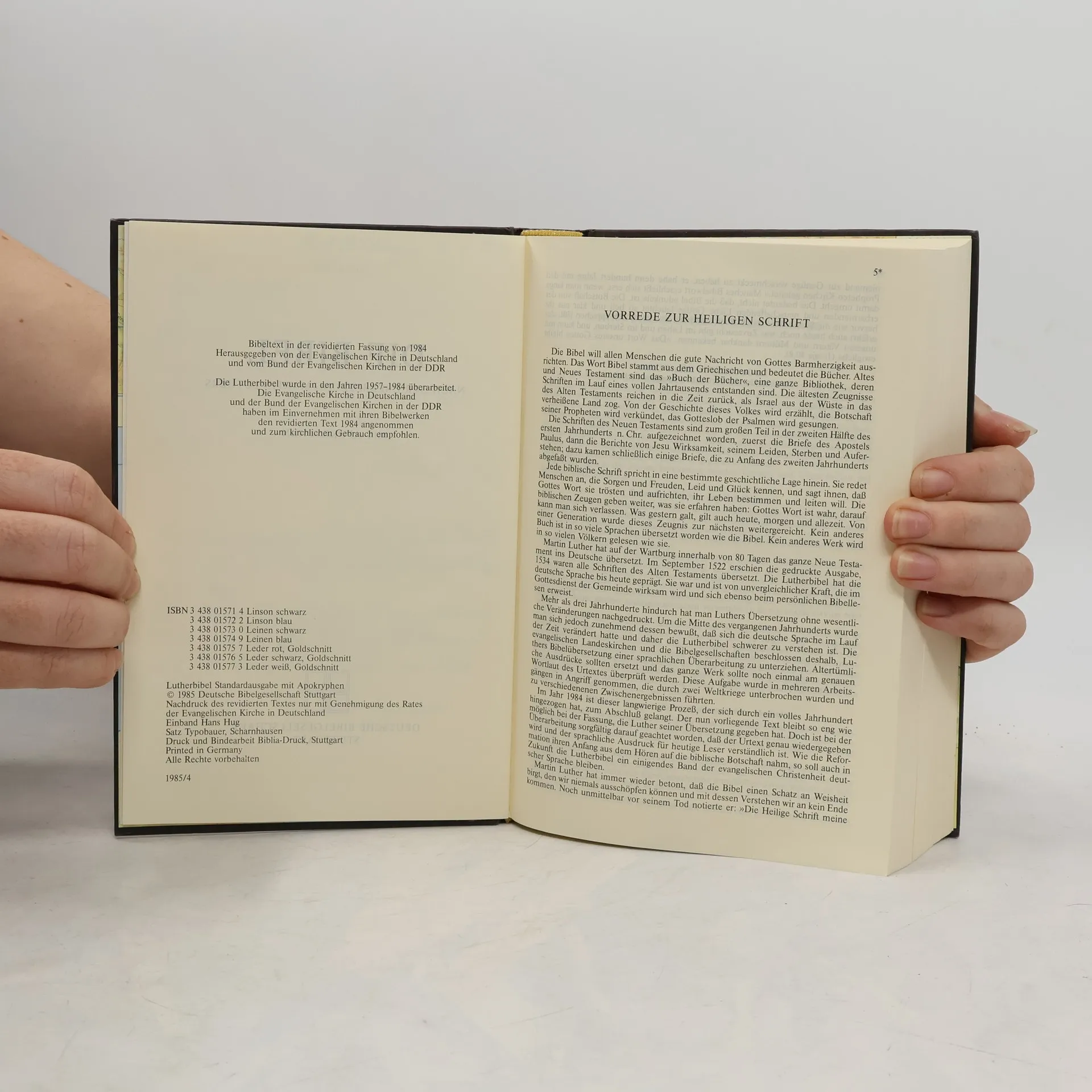 Die Standardausgabe der Lutherbibel 1984 in alter Rechtschreibung mit Apokryphen. Zweispaltig, versweise gesetzt, fett gedruckte Kernstellen, Verweisstellen zwischen den Versen. Mit ausführlichem Anhang und mehrfarbigen Landkarten.