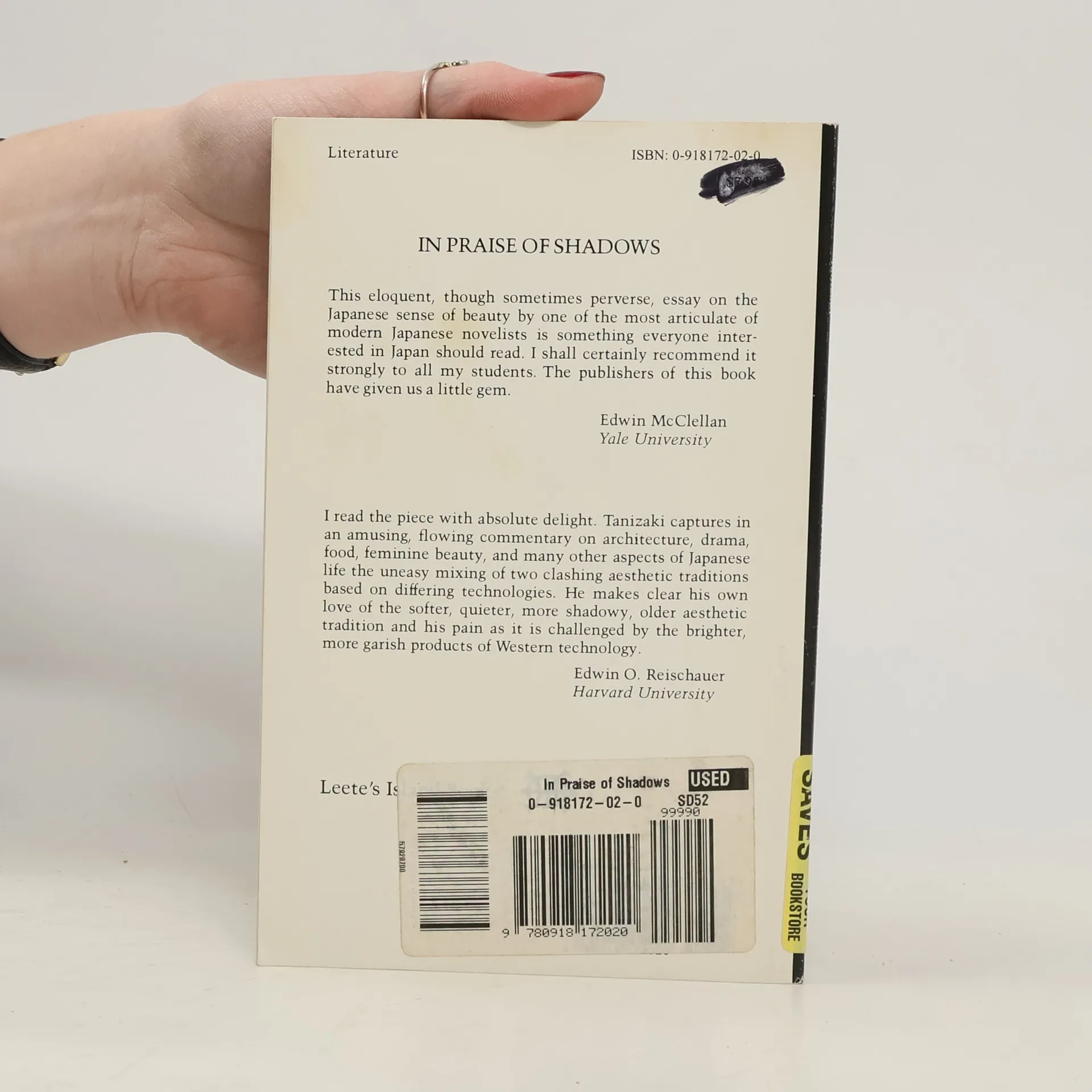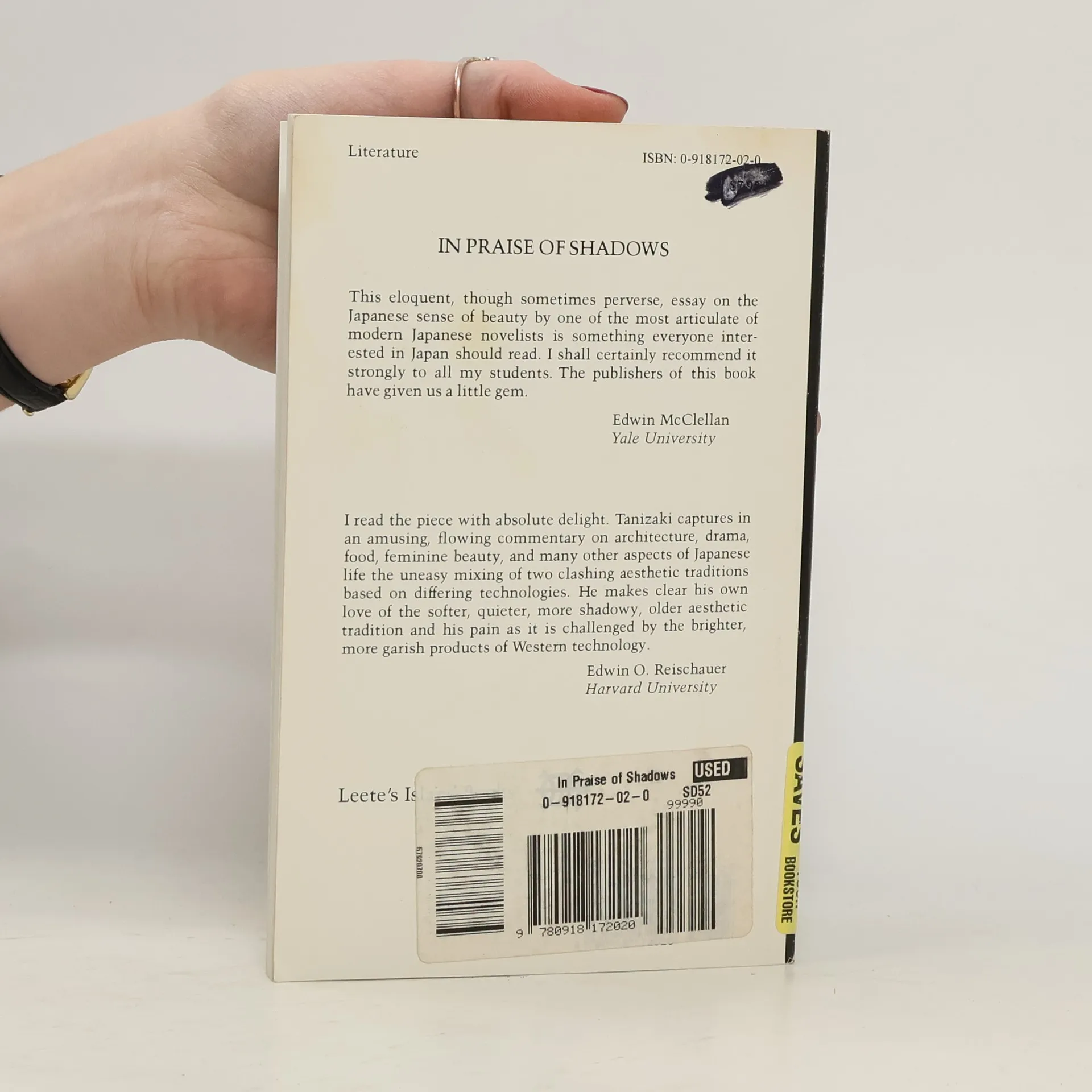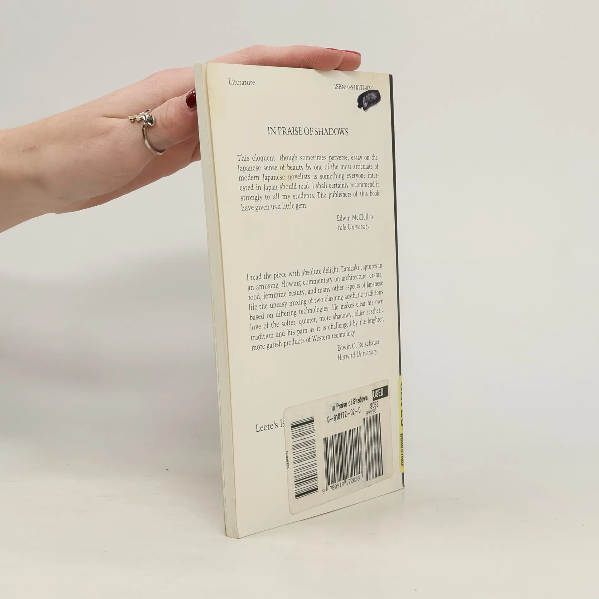 Widely considered to be a classic, this essay on Japanese aesthetics by a major author ranges from the patina of lacquerware and the custom of moon-viewing to monastery toilets and the lighting in a brothel, while contrasting the Japanese sense of subtlety and nuance with Western imports such as electric lighting