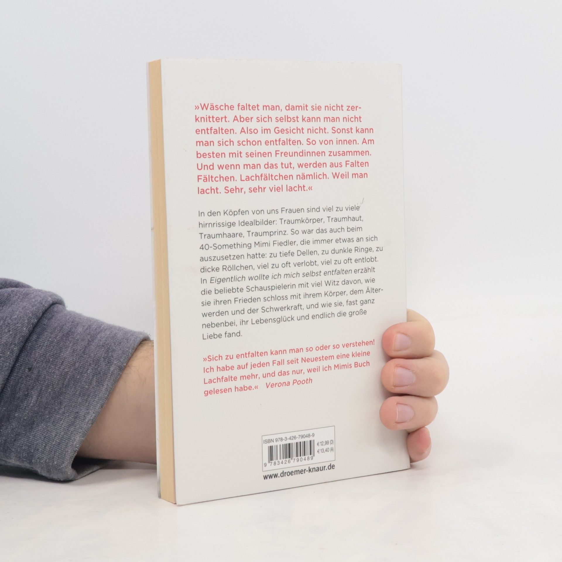 In den Köpfen vieler Frauen existieren unrealistische Idealbilder: Traumkörper, Traumhaut, Traumhaare, Traumprinz. So erging es auch der 40-jährigen Mimi Fiedler, die stets an sich selbst herumkritisierte: zu viele Dellen, dunkle Ringe, dicke Röllchen, häufige Verlobungen und Entlobungen. Mit viel Witz erzählt die beliebte Schauspielerin, wie sie Frieden mit ihrem Körper, dem Älterwerden und den Herausforderungen des Lebens schloss und dabei ihr Lebensglück sowie die große Liebe fand. Das Älterwerden bringt sowohl Gelassenheit als auch unerwünschte äußere Veränderungen mit sich – die Folgen von Sonne, Pasta und dem Leben selbst. Mimi Fiedler beschreibt selbstironisch ihre Schockmomente (wie Orangenhaut an der Wade!) und zahlreiche Versuche, den unaufhaltsamen Verfall aufzuhalten. Gleichzeitig schildert sie, wie sie in der Lebensmitte ankommt, sich selbst und ihren Mr. Right findet. Das sympathische Fazit: Jede Frau ist in ihrer Individualität okay, superokay, knallerokay. „Wäsche faltet man, damit sie nicht zerknittert. Aber sich selbst kann man nicht ent-falten. Im Gesicht nicht. Sonst kann man sich schon entfalten. So von innen. Am besten mit seinen Freundinnen zusammen. Und wenn man das tut, werden aus Falten Fältchen. Lachfältchen nämlich. Weil man lacht. Sehr, sehr viel lacht.“