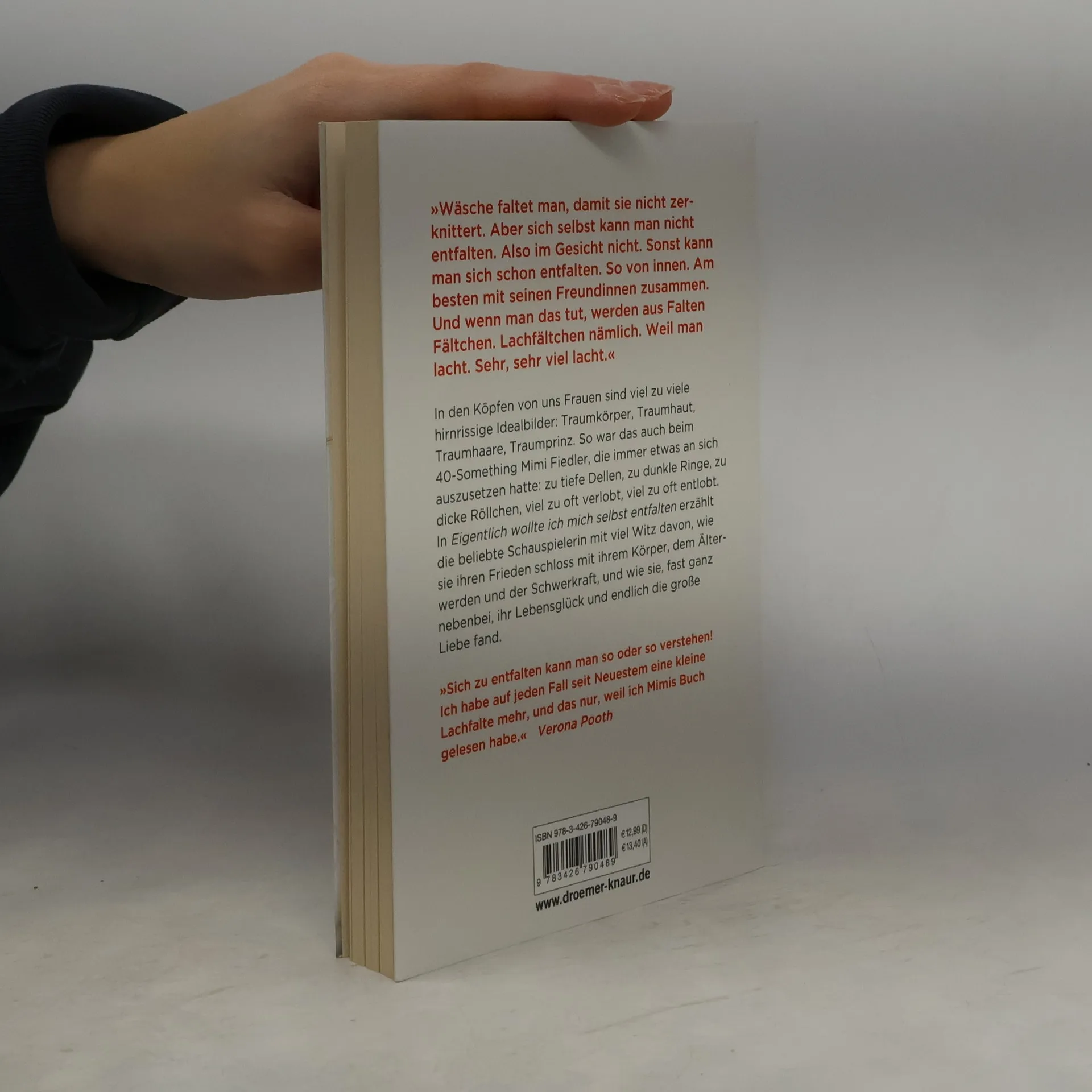 In den Köpfen vieler Frauen existieren unrealistische Idealbilder: Traumkörper, Traumhaut, Traumhaare, Traumprinz. So erging es auch der 40-jährigen Mimi Fiedler, die stets an sich selbst herumkritisierte: zu viele Dellen, dunkle Ringe, dicke Röllchen, häufige Verlobungen und Entlobungen. Mit viel Witz erzählt die beliebte Schauspielerin, wie sie Frieden mit ihrem Körper, dem Älterwerden und den Herausforderungen des Lebens schloss und dabei ihr Lebensglück sowie die große Liebe fand. Das Älterwerden bringt sowohl Gelassenheit als auch unerwünschte äußere Veränderungen mit sich – die Folgen von Sonne, Pasta und dem Leben selbst. Mimi Fiedler beschreibt selbstironisch ihre Schockmomente (wie Orangenhaut an der Wade!) und zahlreiche Versuche, den unaufhaltsamen Verfall aufzuhalten. Gleichzeitig schildert sie, wie sie in der Lebensmitte ankommt, sich selbst und ihren Mr. Right findet. Das sympathische Fazit: Jede Frau ist in ihrer Individualität okay, superokay, knallerokay. „Wäsche faltet man, damit sie nicht zerknittert. Aber sich selbst kann man nicht ent-falten. Im Gesicht nicht. Sonst kann man sich schon entfalten. So von innen. Am besten mit seinen Freundinnen zusammen. Und wenn man das tut, werden aus Falten Fältchen. Lachfältchen nämlich. Weil man lacht. Sehr, sehr viel lacht.“