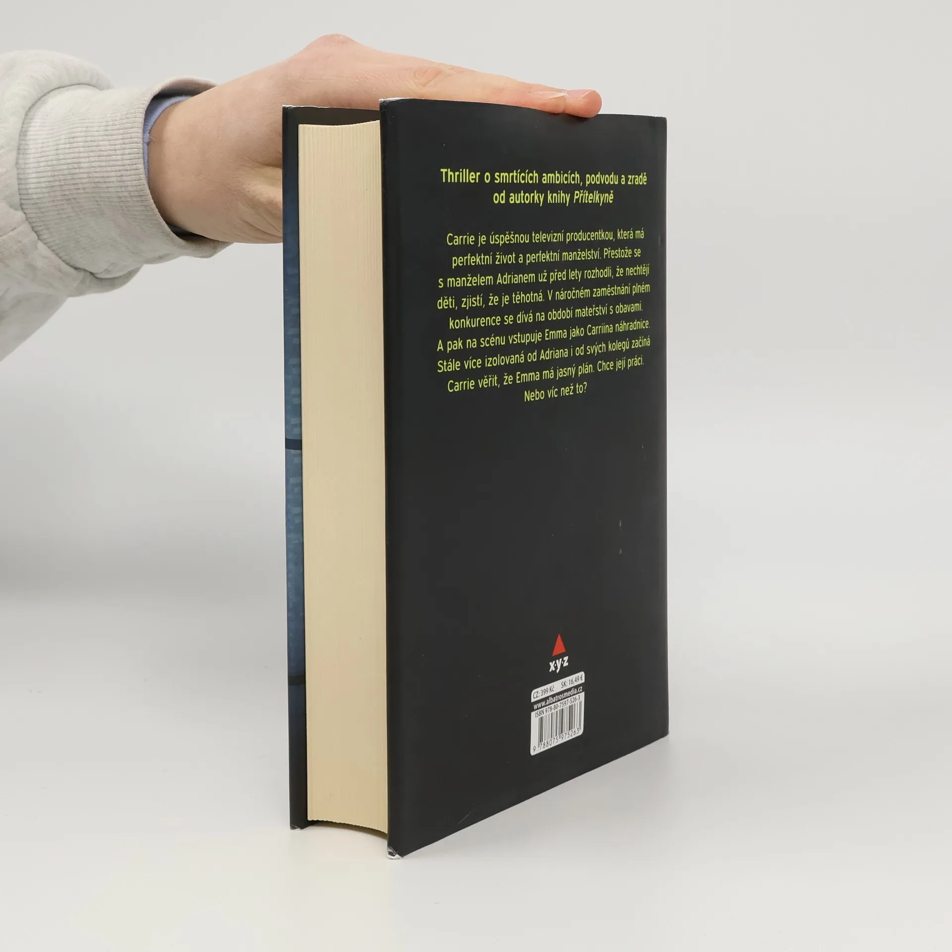 "Thriller o smrtících ambicích, podvodu a zradě od autorky knihy Přítelkyně" Carrie je úspěšnou televizní producentkou, která má perfektní život a perfektní manželství. Přestože se s manželem Adrianem už před lety rozhodli, že nechtějí děti, zjistí, že je těhotná. V náročném zaměstnání plném konkurence, se dívá na období mateřství s obavami. A pak na scénu vstupuje Emma jako Carriina náhradnice. Stále více izolovaná od Adriana i od svých kolegů začíná Carrie věřit, že Emma má jasný plán. Chce její práci. Nebo víc než to?