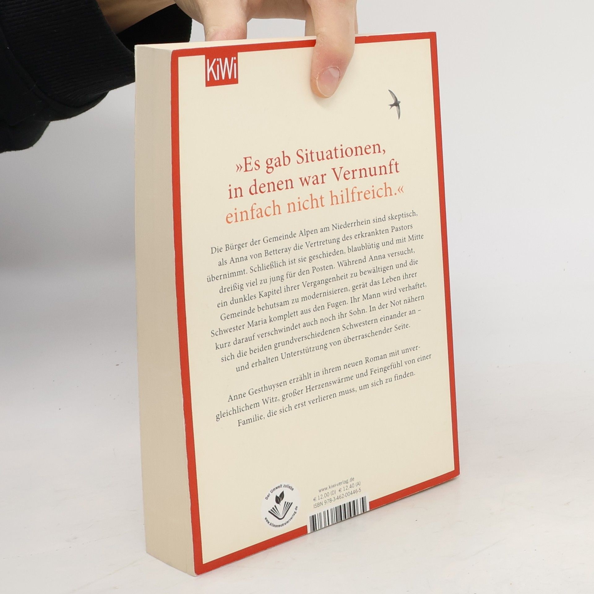 Anne Gesthuysen erzählt in ihrem vierten Roman mit unvergleichlichem Witz, großer Herzenswärme und Feingefühl von einer Familie am Niederrhein, die sich erst verlieren muss, um sich zu finden. Die Bürger der Gemeinde Alpen sind skeptisch, als Anna von Betteray die Vertretung des erkrankten Pastors übernimmt. Schließlich ist sie geschieden, blaublütig und mit Mitte dreißig viel zu jung für den Posten. Während Anna versucht, ein dunkles Kapitel ihrer Vergangenheit zu bewältigen und die Gemeinde behutsam zu modernisieren, gerät das Leben ihrer Schwester Maria komplett aus den Fugen. Ihr Mann wird verhaftet, kurz darauf verschwindet auch noch ihr Sohn. In der Not nähern sich die beiden grundverschiedenen Schwestern einander an – und erhalten Unterstützung von überraschender Seite.