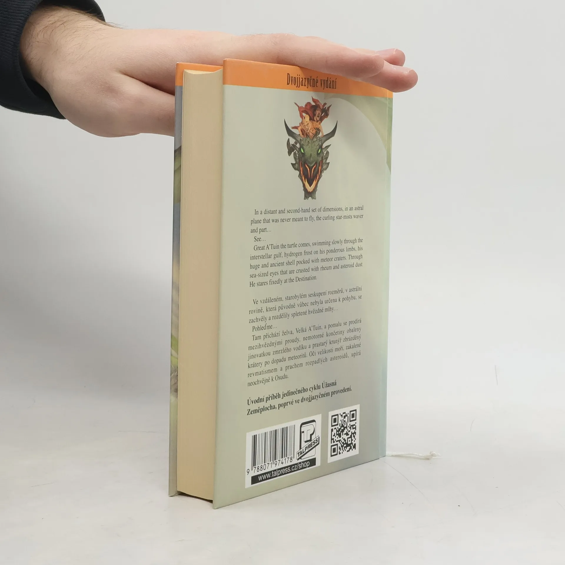 Úvodní příběh jedinečného cyklu Úžasná Zeměplocha, jehož autorem je Terry Pratchett, poprvé ve dvojjazyčném provedení. Ve vzdáleném, starobylém seskupení rozměrů, v astrální rovině, která původně vůbec nebyla určena k pohybu, se zachvěly a rozdělily spletené hvězdné mlhy... Pohleďme... Tam přichází želva, Velká A'Tuin, a pomalu se prodírá mezihvězdnými proudy, nemotorné končetiny obaleny jinovatkou zmrzlého vodíku a prastarý krunýř zbrázděný krátery po dopadu meteoritů. Oči velikosti moří, zakalené revmatismem a prachem rozpadlých asteroidů, upírá neochvějně k Osudu.