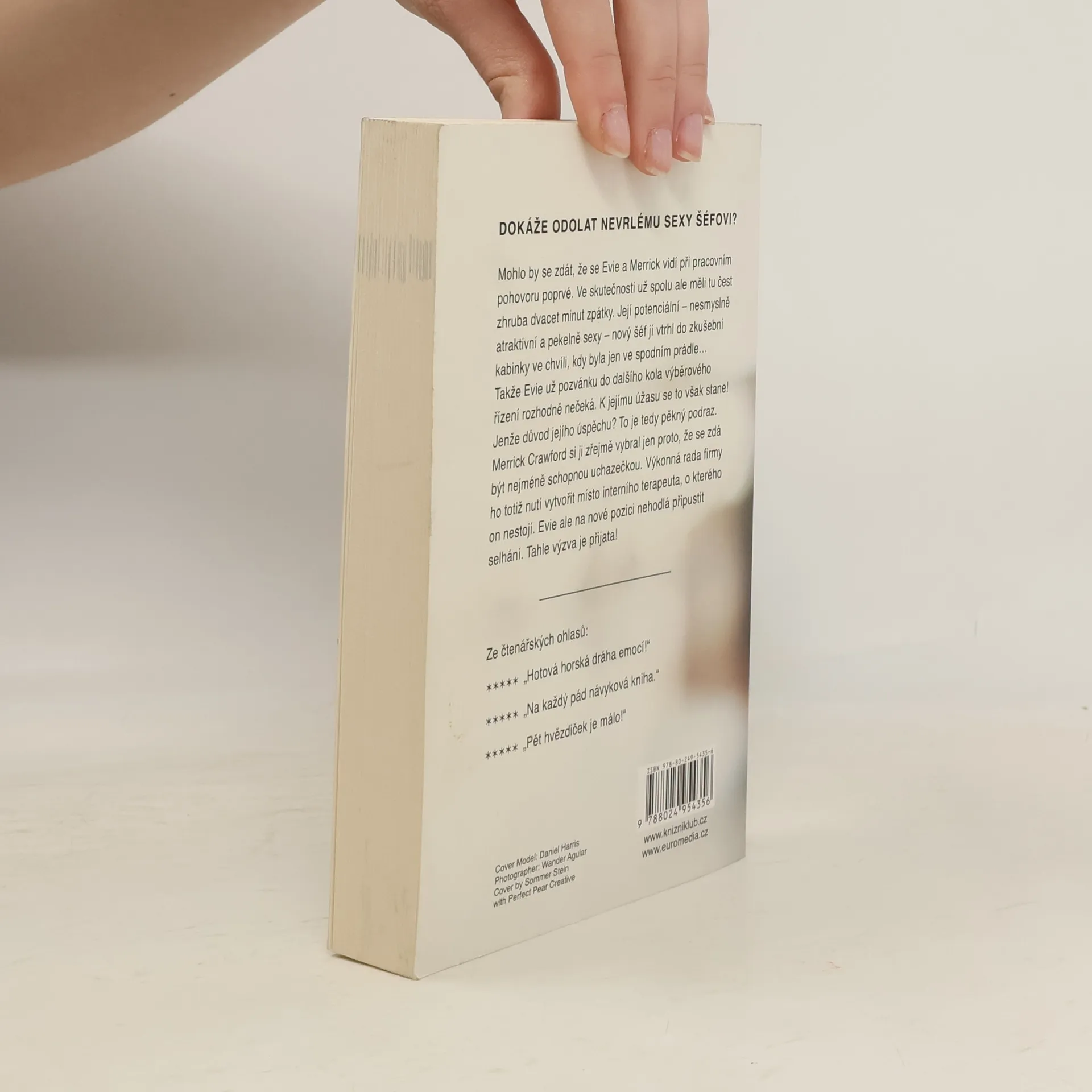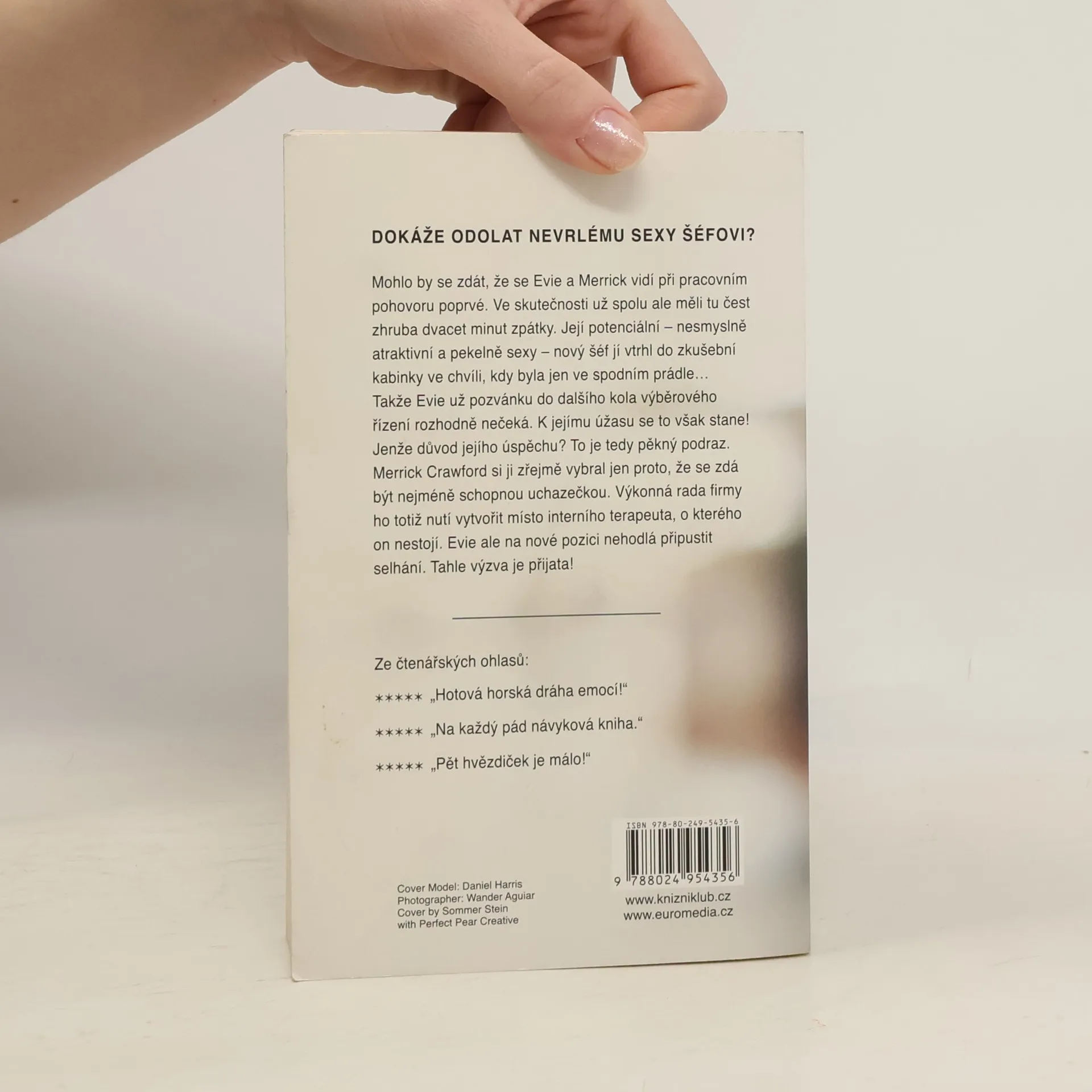 Vtipný milostný román o vztahu Merricka, který se stane šéfem psychoterapeutky Evie a který nezačal zrovna nejlépe. Mohlo by se zdát, že se Evie a Merrick vidí při pracovním pohovoru poprvé. Ve skutečnosti už spolu ale měli tu čest zhruba dvacet minut zpátky. Její potenciální, nesmyslně atraktivní a pekelně sexy nový šéf vtrhl do zkušební kabinky ve chvíli, kdy byla jen ve spodním prádle... Takže tu práci Evie nejspíš nedostane. Když se však stane opak, nemůže tomu uvěřit. Nicméně Evie se toho nebojí, dokáže svému novému šéfovi, že na to má. Musí ale dávat pozor, aby se nespálila... Nakladatelská anotace.