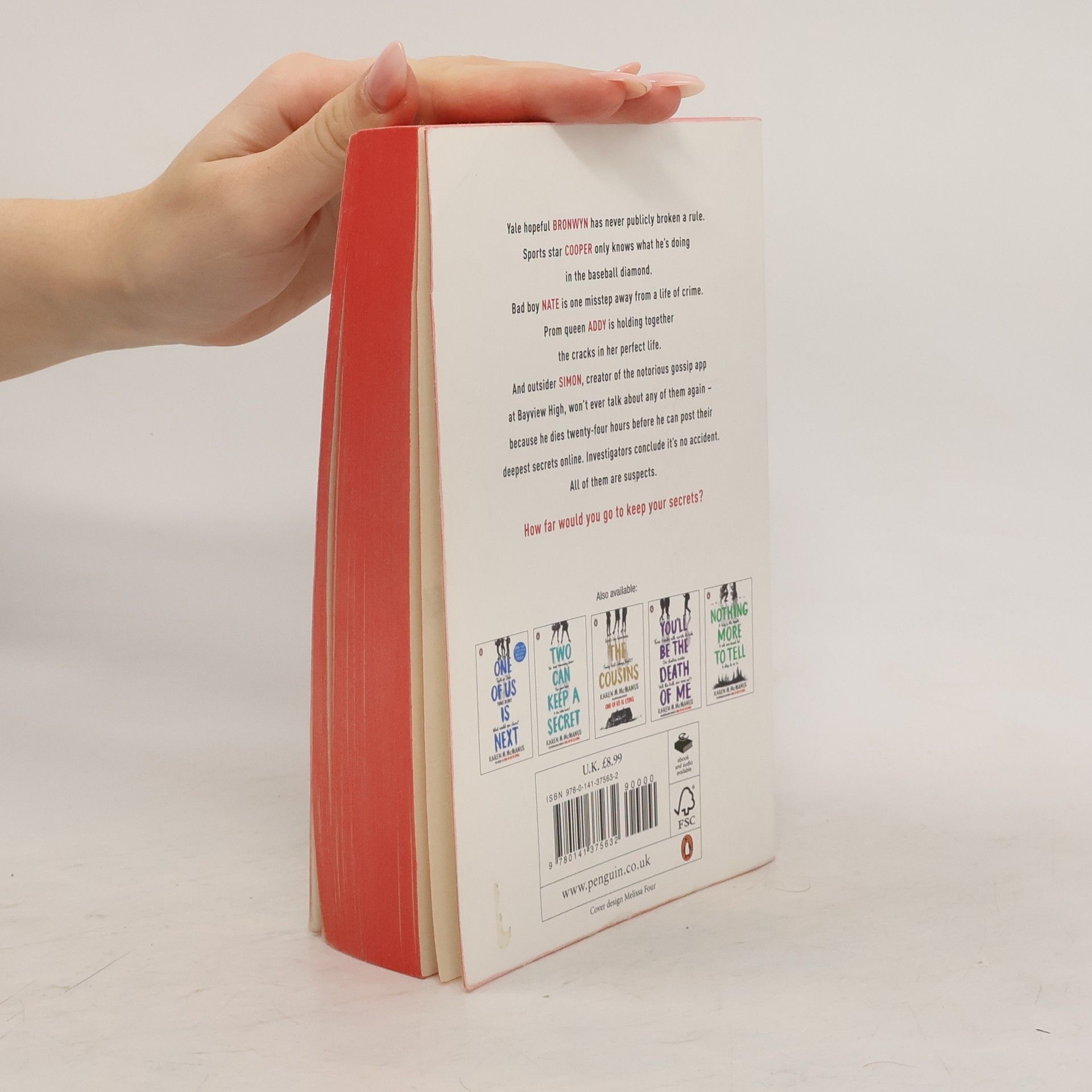 On Thursday afternoon, five students at Bayview High walk into detention. Bronwyn,the brain, is Yale-bound and never breaks a rule. Addy, the beauty, is the picture-perfect homecoming princess. Nate,the criminal,is already on probation for dealing. Cooper,the athlete,is the all-star baseball pitcher. And Simon,the outcast,is the creator of Bayview High's notorious gossip app. Only, Simon never makes it out of that classroom. Before the end of detention, Simon's dead. And according to investi-gators, his death wasn't an accident. On Thursday, he died. But on Friday, he'd planned to post juicy reveals about all four of his high-profile classmates, which makes all four of them suspects in his murder. Or are they just the perfect patsies for a killer who's still on the loose? Everyone has secrets, right? What really matters is how far you would go to protect them.
