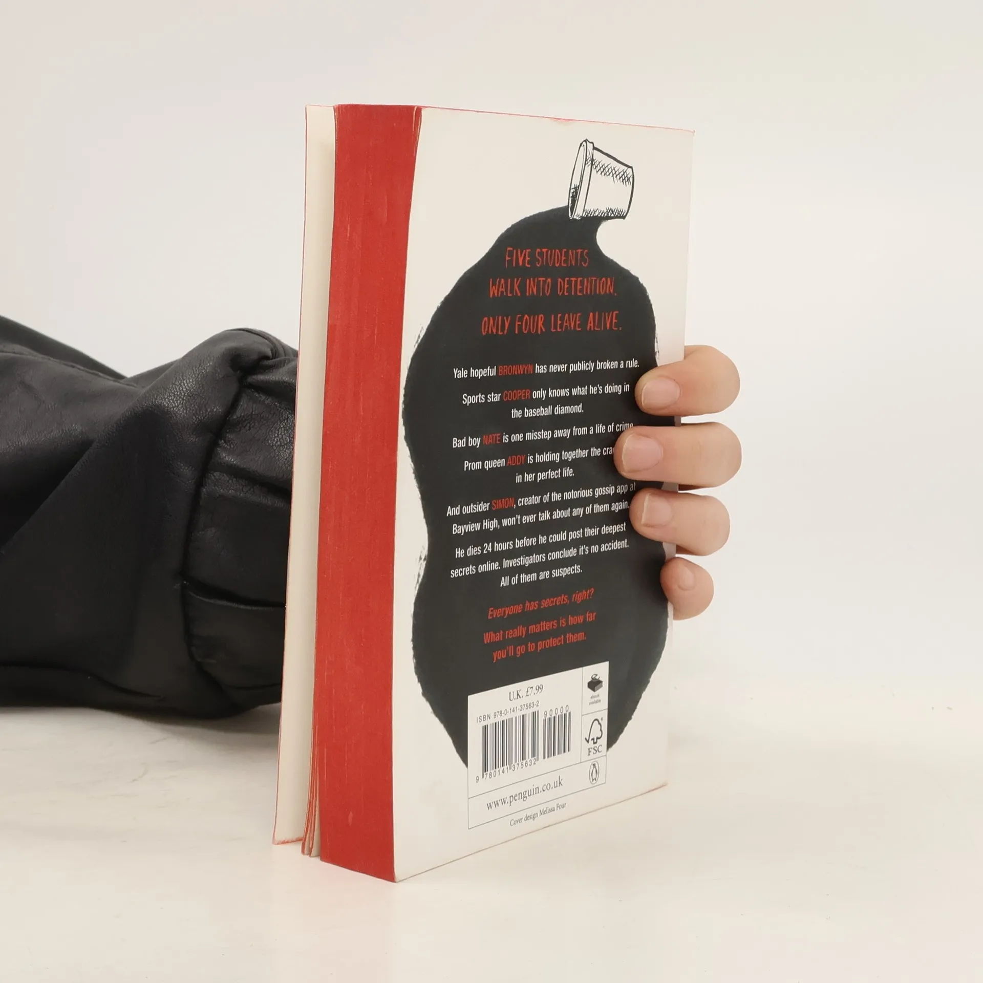 On Thursday afternoon, five students at Bayview High walk into detention. Bronwyn,the brain, is Yale-bound and never breaks a rule. Addy, the beauty, is the picture-perfect homecoming princess. Nate,the criminal,is already on probation for dealing. Cooper,the athlete,is the all-star baseball pitcher. And Simon,the outcast,is the creator of Bayview High's notorious gossip app. Only, Simon never makes it out of that classroom. Before the end of detention, Simon's dead. And according to investi-gators, his death wasn't an accident. On Thursday, he died. But on Friday, he'd planned to post juicy reveals about all four of his high-profile classmates, which makes all four of them suspects in his murder. Or are they just the perfect patsies for a killer who's still on the loose? Everyone has secrets, right? What really matters is how far you would go to protect them.